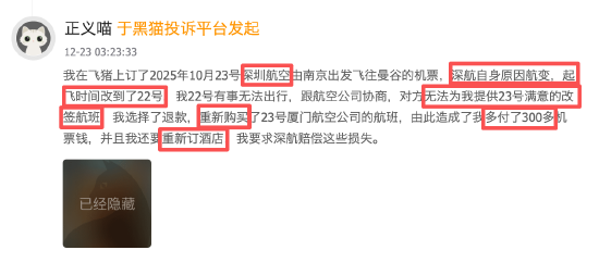 12月黑猫投诉航司领域红黑榜:深圳航空自身原因提前一天起飞让乘客自行承担损失