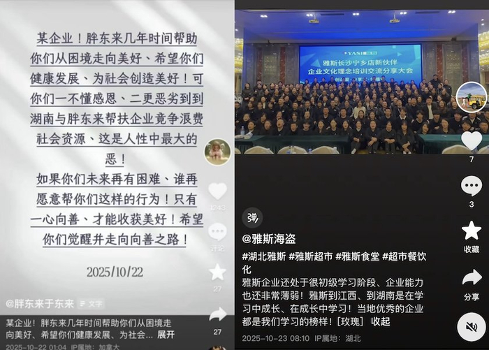 智通财经记者 | 卢奕贝 智通财经编辑 | 牙韩翔 在于东来似乎成为中国零售行业"教父"一般的存在以前,湖北雅斯就已是胖东来的学徒。湖北雅斯公众 号自2015年起多次发布"东来授慧雅斯"等内容,杜晓宜本人还接受过胖东来网络影视中心的专访,到今 年6月还在社交平台上发布对于东来、胖东来的学习笔记。 而这个学徒眼下也试图将调改的经验整理成方法论或产品服务,向同行输出赋能——就像于东来一样。 10月22日,胖东来创始人于东来在社交平台上点名批评了一家被帮扶过的企业。 于东来指该企业不懂感恩,去湖南与胖东来被帮扶企业竞争浪费社会资源,"这是人性中最大的恶"。 智通财经检根据公开资料查阅到,近期进入湖南市场,且接受胖东来帮扶的企业为湖北雅斯超市。该超 市在不久前的8月宣布进驻湖南,在长沙高铁吾悦广场、松雅湖吾悦广场、宁乡吾悦广场开出三家门 店。而湖南是步步高超市的大本营,目前正接受胖东来帮扶调改。 目前,双方暂未明确表态,而智通财经就此事向湖北雅斯方面求证,截至发稿暂未收到回应。 10月23日,湖北雅斯集团的社交平台账号"雅斯海盗"发文,称雅斯企业还处于很初级学习阶段、企业能 力也还非常薄弱。雅斯到江西、到湖南是在学习 ...