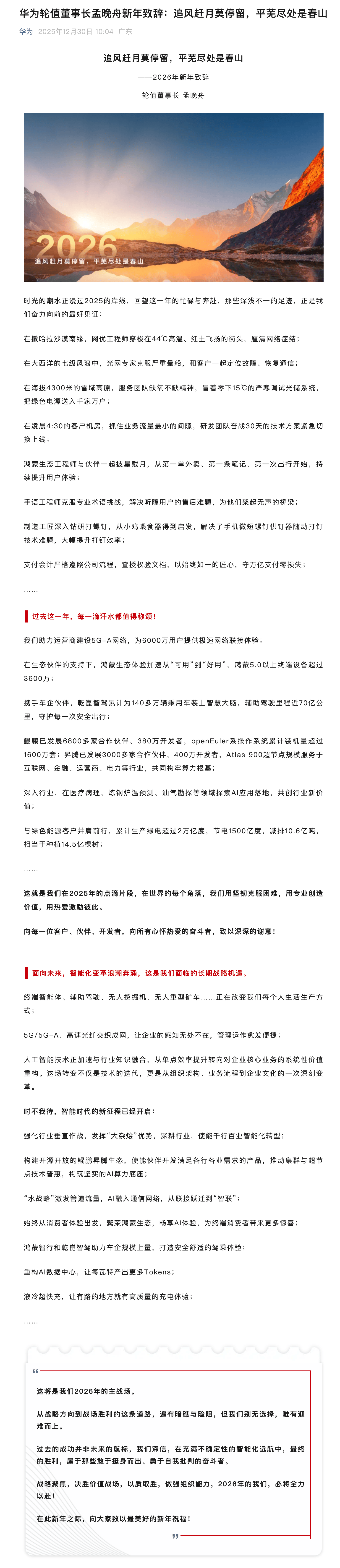12月30日,华为轮值董事长孟晚舟发表2026年新年致辞,题为《追风赶月莫停留,平芜尽处是春山》。"面向未来,智能化变革浪潮奔涌,这是我们面临的 长期战略机遇。"孟晚舟写道:时不我待,智能时代的新征程已经开启,"过去的成功并非未来的航标,我们深信,在充满不确定性的智能化远航中,最终的 胜利,属于那些敢于挺身而出、勇于自我批判的奋斗者。" 在大西洋的七级风浪中,光网专家克服严重晕船,和客户一起定位故 在海拔4300米的雪域高原,服务团队缺氧不缺精神,冒着零下15℃p 把绿色电源送入千家万户; 在凌晨4:30的客户机房, 抓住业务流量最小的间隙, 研发团队奋战3 换上线; 鸿蒙生态工程师与伙伴一起披星戴月,从第一单外卖、第一条笔记、 续提升用户体验; 手语工程师克服专业术语挑战,解决听障用户的售后难题,为他们架, 制造工匠深入钻研打螺钉,从小鸡喂食器得到启发,解决了手机微知 技术难题,大幅提升打钉效率; 支付会计严格遵照公司流程,查授权验文档,以始终如一的匠心、守 . . 过去这一年,每一滴汗水都值得称颂! 我们助力运营商建设5G-A网络,为6000万用户提供极速网络联接体 在生态伙伴的支持下,鸿蒙生态体验加速从 ...