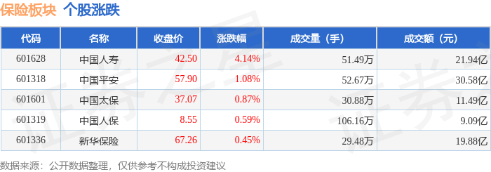 从资金流向上来看,当日保险板块主力资金净流入3.68亿元,游资资金净流出1.43亿元,散户资金净流出 2.25亿元。保险板块个股资金流向见下表: 证券之星消息,10月20日保险板块较上一交易日上涨2.15%,中国人寿领涨。当日上证指数报收于 3863.89,上涨0.63%。深证成指报收于12813.21,上涨0.98%。保险板块个股涨跌见下表: | 代码 | 名称 | 收盘价 | 涨跌幅 | 成交量(手) | 成交额(元) | | --- | --- | --- | --- | --- | --- | | 601628 | 中国人寿 | 42.50 | 4.14% | 51.49万 | 21.94亿 | | 601318 | 中国平安 | 57.90 | 1.08% | 52.67万 | 30.58亿 | | 601601 | 中国太保 | 37.07 | 0.87% | 30.88万 | 11.49 亿 | | 61319 | 中国人保 | 8.55 | 0.59% | 106.16万 | 9.09亿 | | 601336 | 新华保险 | 67.26 | 0.45% | 29.48万 | 19.88 G ...