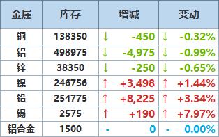 》查看更多金属库存信息 LME库存 | 地点 | | | 前日库存 入库 出库 今日库存 | | 变动 | 注册仓单 | 注销仓单 | 注销占比 | | --- | --- | --- | --- | --- | --- | --- | --- | --- | | 铝 | 056805 | 0 | | 4975 498975 | -4975 | 405700 | 93275 | 18.69% | | 巴生港 | 311525 | 0 | 3925 | 307600 | -3925 | 215675 | 91925 | 29.88% | | 光阳 | 140950 | 0 | 0 | 140950 | 0 | 140775 | 175 | 0.12% | | 高雄 | 45300 | 0 | 0 | 45300 | 0 | 45300 | 0 | 0.00% | | 鹿特丹 | 3575 | 0 | 0 | 3575 | 0 | 2450 | 1125 | 31.47% | | 菜佛 | 1225 | 0 | 0 | 1225 | 0 | 1225 | 0 | 0.00% | | 新加坡 | 1325 | 0 ...