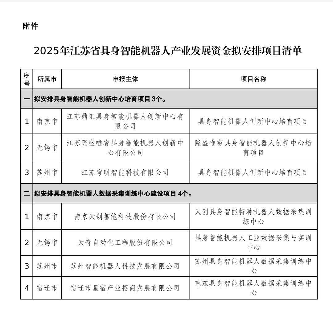 4个具身智能机器人数据采集训练中心建设项目,分别落户南京、无锡、苏州和宿迁。具体包括:南京天创智能科技股份有限公司,天创具身智能特种机 器人数据采集训练中心;无锡市的天奇自动化工程股份有限公司,具身智能机器人工业数据采集与实训中心;苏州智能机器人科技发展有限公司,苏州具 身智能机器人数据采集训练中心;宿迁市星宿产业招商发展有限公司 京东具身智能机器人数据采集训练中心。 2025年是具身智能机器人"元年"。11 月 20 日,记者从江苏省工业和信息化厅获悉,江苏3个具身智能机器人创新中心培育项目和4个具身智能机器人数据 采集训练中心建设项目,有望获得2025 年度江苏省具身智能机器人产业发展资金的支持。 | 序号 | 所属市 | 申报主体 | 项目名称 | | --- | --- | --- | --- | | | | 拟安排具身智能机器人创新中心培育项目 3个。 | | | T | 南京市 | 江苏鼎汇具身智能机器人创新中心有 | 具身智能机器人创新中心培育项目 | | | | 限公司 | | | 2 | 无锡市 | 江苏隆盛唯容具身智能机器人创新中 | 隆盛唯睿具身智能机器人创新中心培 | | | | 心有 ...