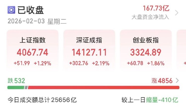 市场整体表现 - 2月3日A股走出“V型”行情,主要指数全线上涨,沪指收涨1.29%报4067.74点,深证成指收涨2.19%,创业板指收涨1.86%报3324.89点,科创50、沪深300、上证50涨幅均超1%,北证50涨逾3% [4] - 市场赚钱效应较好,4856只个股收红,83只个股涨停,532只个股收跌,22只个股跌停 [1][13] - 沪深京三市日成交额微缩411.4亿元至2.67万亿元,截至2月2日,三市两融余额为2.71万亿元 [4] 行业与板块表现 - 31个申万一级行业中,除银行微跌外其余均收红,其中24个板块涨幅超过1% [8] - 科技股和资源股引领反弹,专用设备、航空航天、光电子器件、化肥农药、HIT电池等板块大涨,而中特估、银行、石油天然气、AI芯片表现不佳 [6] - 综合板块涨幅居首,收涨5.63%,国防军工板块涨逾4%,有色金属、钢铁、基础化工等资源板块也表现强劲 [8] - 机械设备板块表现抢眼,板块指数上涨3.98%,11只相关个股涨停,罗博特科“20cm”涨停,杰普特、燕麦科技、春晖智控等大涨 [9][10] - 电力设备板块掀起涨停潮,板块指数上涨3.22%,16只个股涨停,泽润新能、帝科股份、奥特维、海优新材“20cm”涨停 [10] - 有色金属板块反弹,板块指数上涨3.25%,晓程科技收涨18.67%,东方钽业、湖南黄金涨停 [11][12] 市场驱动因素分析 - 受访人士认为,情绪修复带动指数反弹,关键点位支撑有效、恐慌盘出清吸引抄底资金,权重板块企稳以及活跃题材带动人气是主要驱动因素 [15] - 政策利好与行业景气度形成双重驱动,国家推进的“大规模设备更新”政策为机械设备行业提供需求指引,全球流动性宽松预期与地缘局势不确定性为有色等资源板块提供支撑 [12] - 军工、机械设备等科技股反弹源于订单回补预期与AI+制造产业升级的双重催化,有色等资源股走强则受益于全球再通胀交易与国内基建投资前置 [13] - 此次上涨被视作前期回调后的技术性修复,部分指数和板块已回落至合理估值区间,叠加市场对“春节躁动”行情的预期,吸引抄底资金入场 [15] 市场情绪与资金面 - 尽管指数反弹,但节前避险情绪依然存在,增量资金并未大规模入场,量能微缩清晰地反映了市场的谨慎心态 [3][15] - 量能萎缩背后,一方面是春节临近部分主力资金选择持币过节,另一方面是投资者信心尚未完全恢复,多数资金处于观望状态 [16] - “缩量反弹”反映了节前特殊时间窗口下空头抛压衰竭与多头试探性回补的短暂平衡,反弹逻辑更多依托政策预期托底与超跌品种估值修复,而非基本面强劲驱动 [16] 后市展望 - 受访人士预计,短期内市场可能出现反复,大概率进入止跌震荡整理阶段,难以形成单边上涨行情 [3][18] - 在政策持续托底、流动性维持合理充裕的背景下,A股整体运行重心有望保持稳定,随着基本面修复,行情驱动因素将由情绪与估值切换至盈利和景气度变化 [18] - 上证指数临近4000点整数关口具备较强技术支撑,年初以来获利盘兑现压力已充分释放,市场牛市基础未发生根本改变 [18] - 节后行情核心变量在于两会政策落地强度与中美博弈演进,若稳增长政策超预期则春季躁动有望延续,反之需警惕缩量反弹后的二次探底 [19]