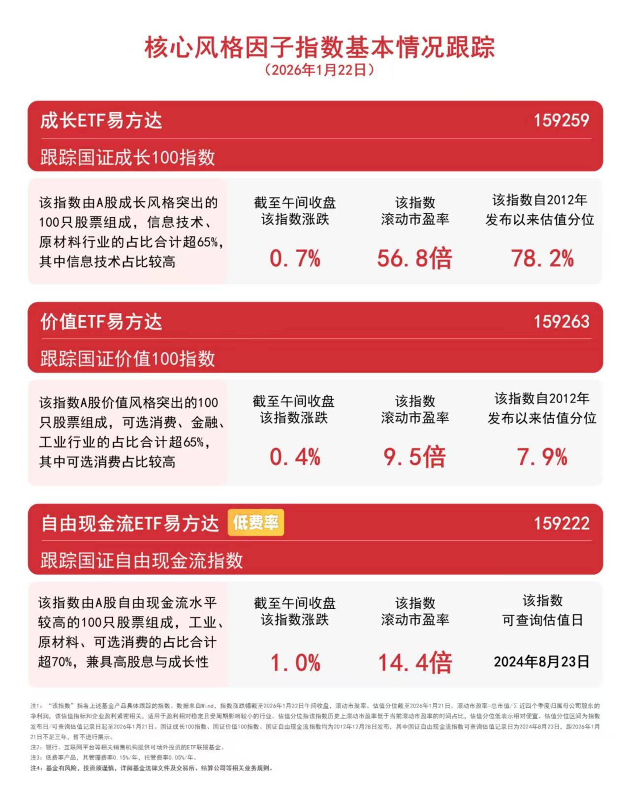 市场板块表现 - 1月22日早盘,煤炭、化工、建筑材料等行业板块涨幅居前 [1] - 截至午间收盘,国证自由现金流指数上涨1.0% [1] - 截至午间收盘,国证成长100指数上涨0.7% [1] - 截至午间收盘,国证价值100指数上涨0.4% [1]