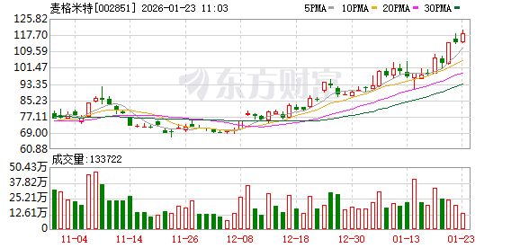 公司发布的三季报数据显示,前三季度公司共实现营业收入67.91亿元,同比增长15.05%,实现净利润 2.13亿元,同比下降48.29%,基本每股收益为0.3911元,加权平均净资产收益率3.46%。(数据宝) (文章来源:证券时报网) 证券时报·数据宝统计显示,麦格米特所属的电力设备行业,目前整体涨幅为2.91%,行业内,目前股价 上涨的有349只,涨停的有拉普拉斯、飞沃科技等19只。股价下跌的有46只,跌幅居前的有华瑞股份、 凯发电气、大洋电机等,跌幅分别为3.56%、3.11%、2.09%。 两融数据显示,该股最新(1月22日)两融余额为36.88亿元,其中,融资余额为36.57亿元,近10日增加 2.50亿元,环比增长7.35%。 麦格米特股价再创历史新高,该股近期呈不断突破新高之势,近一个月累计有11个交易日股价刷新历史 纪录。截至10:09,该股目前上涨4.33%,股价报119.00元,成交843.97万股,成交金额9.88亿元,换手 率1.84%,该股最新A股总市值达654.59亿元,该股A股流通市值544.86亿元。 ...
