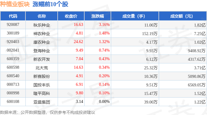 种植业板块10月29日涨0.65%,神农种业领涨,主力资金净流入2836.1万元