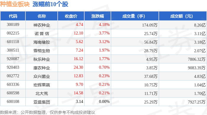 板块整体表现 - 2024年10月29日种植业板块整体上涨0.65%,领先个股为神农种业[1] - 当日上证指数上涨0.7%报收4016.33点,深证成指上涨1.95%报收13691.38点[1] - 板块整体资金流向呈现主力资金净流入2836.1万元,游资资金净流出7225.43万元,散户资金净流入4389.33万元[2] 领涨个股表现 - 神农种业涨幅4.18%表现最佳,收盘价4.74元,成交额8.26亿元,成交量174.09万手[1] - 诺普信涨幅3.77%排名第二,收盘价12.10元,成交额3.11亿元,成交量25.74万手[1] - 海南橡胶涨幅3.12%排名第三,收盘价5.62元,成交额3.18亿元,成交量56.84万手[1] - 雪榕生物涨幅1.97%收盘价7.24元,秋乐种业涨幅1.77%收盘价16.12元[1] 领跌个股表现 - 万向德农跌幅2.17%表现最弱,收盘价9.03元,成交额8684.29万元[2] - 华绿生物跌幅1.86%收盘价16.93元,博国科技跌幅1.41%收盘价8.38元[2] - 新农开发跌幅1.13%收盘价7.01元,新赛股份跌幅0.81%收盘价4.90元[2] 个股资金流向 - 神农种业主力资金净流入6522.89万元,主力净占比7.90%,但游资和散户资金分别净流出[3] - 雪榕生物主力资金净流入2804.48万元,主力净占比13.56%,游资净流出1462.90万元[3] - 诺普信主力资金净流入2193.62万元,主力净占比7.06%,游资净流出4505.34万元[3] - 海南橡胶主力资金净流入1313.05万元,主力净占比4.13%[3]