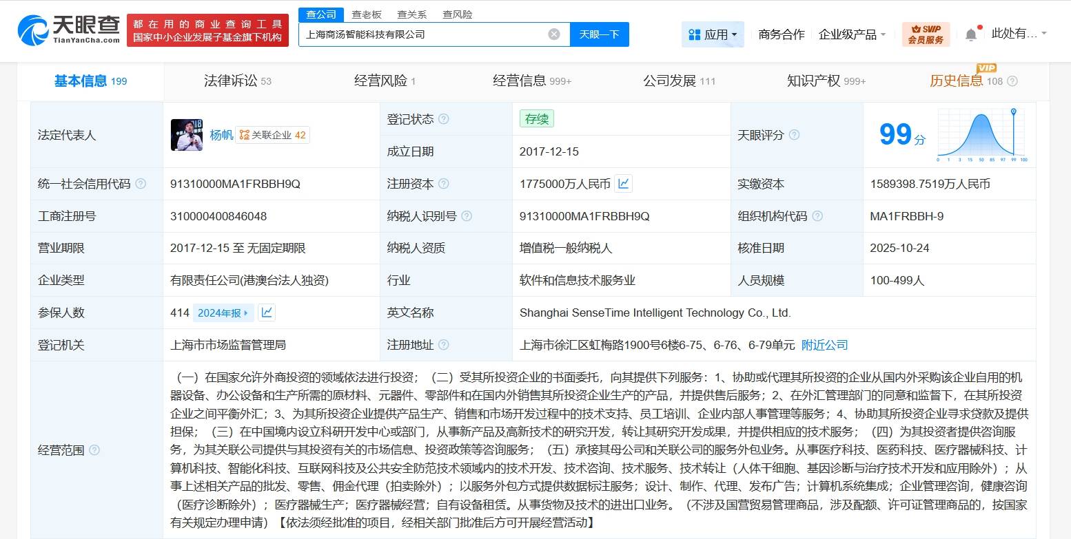 公司基本信息 - 公司名称为上海商汤智能科技有限公司,成立于2017年12月15日 [1][2] - 法定代表人及关联企业数量为42家,由商汤集团有限公司全资持股 [1][2] - 公司注册资本由162.5亿人民币增至177.5亿人民币,增幅约9% [1] - 公司登记状态为存续,企业类型为有限责任公司(港澳台法人独资) [1][2] - 注册地址位于上海市徐汇区虹梅路1900号6楼6-75、6-76、6室 [2] 公司经营与行业 - 公司所属行业为软件和信息技术服务业 [2] - 经营范围包括在国家允许外商投资的领域依法进行投资,以及为其所投资企业提供技术支持、员工培训、企业内部人事管理等服务 [1][2] - 具体业务涉及计算机科技、智能化科技、互联网科技及公共安全防范技术领域内的技术开发、技术咨询、技术服务、技术转让 [2] - 公司参保人数为414人(2024年年报数据) [2]