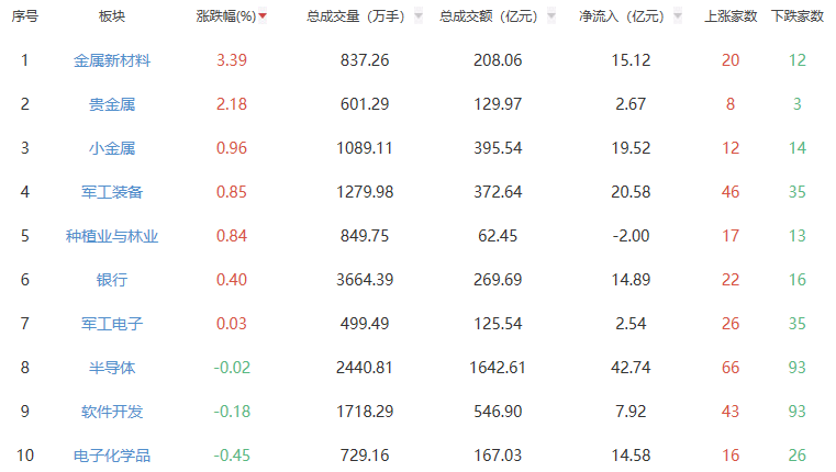 | 序号 | 板块 | 涨跌幅(%)▼ | 总成交量(万手) | | 净流入 (亿元) ▼ | 上涨家数 | 下跌家数 | | --- | --- | --- | --- | --- | --- | --- | --- | | 1 | 金属新材料 | 3.39 | 837.26 | 208.06 | 15.12 | 20 | 12 | | 2 | 高等国 | 2.18 | 601.29 | 129.97 | 2.67 | B | 3 | | 3 | 小我屋 | 0.96 | 1089.11 | 395.54 | 19.52 | 12 | 14 | | ব | 车 装备 | 0.85 | 1279.98 | 372.64 | 20.58 | 46 | રે રે | | 5 | 种植业与林业 | 0.84 | 849.75 | 62.45 | -2.00 | 17 | 13 | | 6 | 银行 | 0.40 | 3664.39 | 269.69 | 14.89 | 22 | 16 | | 7 | 军工电子 | 0.03 | 499.49 | 125.54 | 2.54 | 26 | રૂટ | | 8 | 半 ...