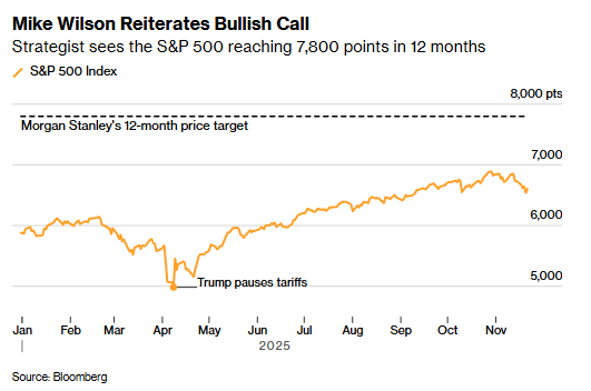 市场近期表现与机构观点 - 近期美国股市因对AI泡沫担忧加剧及美联储12月降息前景存疑而持续遭遇抛售,科技股主导的跌势使标普500指数自10月高点下跌约4% [1] - 华尔街机构对股市未来走势保持乐观,认为当前跌势已近尾声,并看好明年美股持续走强 [1] 摩根士丹利观点 - 摩根士丹利策略师认为近期抛售潮可能已接近尾声,短期若出现进一步回调是布局明年多头仓位的良机 [2] - 该行预计标普500指数未来一年将攀升至7800点,较当前水平有约18%的上涨空间 [2] - 策略团队看好非必需消费品、医疗保健、金融、工业板块及小盘股 [2] - 市场内部弱势信号表明此次调整已接近尾声,而非刚刚开始,但短期不排除仍有波动可能 [2] - 美联储最终将实施降息为股市提供支撑,同时AI技术发展将推动企业效率提升 [4] 德意志银行观点 - 德意志银行看涨信心更甚,认为盈利增长动力将突破超大盘科技股范畴,向更广泛板块扩散,推动标普500指数在2026年底前突破8000点 [5] - 该行预测标普500指数明年每股收益将增长14%至320美元,市场领涨板块将从大型科技股拓展至金融股和周期性板块 [5] - AI的快速发展仍将主导市场情绪,其技术进步将在未来数年转化为显著的生产力提升 [5][6] - 美国经济明年将获得更坚实基础,关税政策不确定性缓解及减税政策对家庭收入的提振将为经济增长注入动力,该行将2026年美国GDP增速预测上调至2.4% [6]