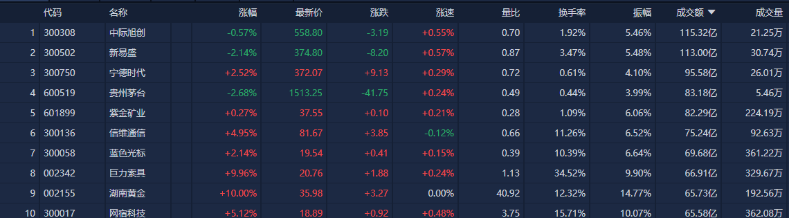 市场整体表现 - 市场早盘探底回升,三大指数集体翻红,此前一度跌超1% [1] - 截至收盘,沪指涨0.11%,深成指涨0.65%,创业板指涨0.65% [1] - 全市场超3800只个股上涨 [1] - 沪深两市半日成交额1.38万亿元,较上个交易日缩量633亿元 [7] 领涨板块与个股 - 化工板块集体走强,沧州大化、金牛化工、百川股份、百合花涨停 [2] - 人形机器人概念表现活跃,五洲新春、联诚精密、天奇股份涨停 [3] - 有色金属板块回暖,湖南黄金、翔鹭钨业涨停 [4] - 光通信概念震荡回升,杭电股份6天5板 [4] - 中药概念开盘活跃,特一药业涨停 [5] - 个股巨力素具涨停,涨幅9.96%,成交额66.91亿元 [9] - 个股北福盛爱涨停,涨幅10.00%,成交额65.73亿元 [9] - 个股网宿科技上涨5.12%,成交额65.58亿元 [9] - 个股信维通信上涨4.95%,成交额75.24亿元 [9] - 个股蓝色光标上涨2.14%,成交额69.68亿元 [9] 下跌板块与个股 - 大消费板块集体下挫,白酒、旅游酒店方向跌幅居前 [6] - 皇台酒业跌停,大连圣亚触及跌停 [6] - 贵州茅台下跌2.68%,成交额83.18亿元 [9] 成交活跃个股 - 中际旭创成交额115.32亿元居首,股价下跌0.57% [8][9] - 新易盛成交额113.00亿元,股价下跌2.14% [8][9] - 宁德时代成交额95.58亿元,股价上涨2.52% [8][9] - 紫金矿业成交额82.29亿元,股价上涨0.27% [8][9]