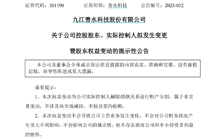 2025.11.08 本 文字数:1161,阅读时长大约2分钟 11月7日,善水科技发布公告称,公司实际控制人黄国荣和吴新艳解除婚姻关系,并进行财产分割。 黄国荣将其直接持有善水科技股份中的1000万股分割到吴新艳名下,同时黄国荣间接持有的股份,包括 正祥投资和泽祥睿宝投资的财产份额分割到吴新艳名下。此外,正祥投资和泽祥睿宝投资的执行事务合 伙人由黄国荣变更为吴新艳。 本次权益变更前,黄国荣与吴新艳为公司的共同实际控制人,黄国荣为公司控股股东,本次权益变动 后,吴新艳为公司的实际控制人、控股股东。 本次权益变更前,吴新艳合计直接及间接持有公司3066.8万股公司股票;本次权益变动后,吴新艳合计 直接及间接持有公司6856.8万股公司股票,占总股本的31.95%。若按照11月7日收盘价格计算,吴新艳 新增持有的3790万股公司股票,市值达9.24亿元。 此外,善水科技同日公告,黄国荣由于个人原因辞去公司第三届董事会董事、董事长和董事会战略委员 会主任委员及总经理的职务,并选举吴新艳为公司第三届董事会董事长,任期至第三届董事会任期届满 之日止。同时,董事会拟聘任吴新艳为公司总经理。根据《公司章程》,董事长为公司法 ...