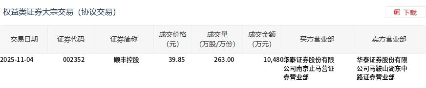 大宗交易概况 - 2025年11月4日顺丰控股发生大宗交易成交263万股成交额1.05亿元占当日总成交额的7.66% [1] - 该笔大宗交易成交价格为39.85元与当日市场收盘价39.85元持平 [1] - 交易明细显示买方营业部为华泰证券股份有限公司南京止马营证券营业部卖方营业部为华泰证券股份有限公司马鞍山湖东路证券营业部 [2] 交易细节 - 具体交易数据为证券代码002352成交价格39.85元成交数量263万股成交金额10480万元 [2] - 交易双方营业部均隶属于华泰证券股份有限公司 [2]