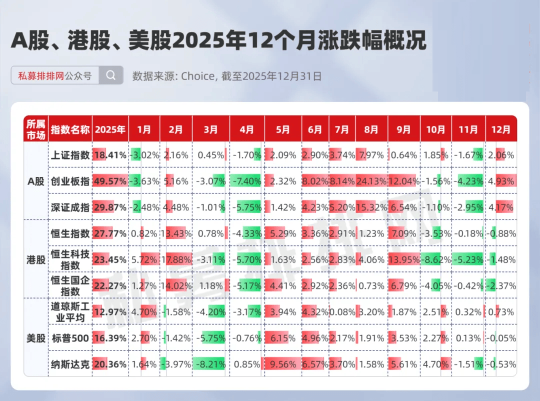 2025年资本市场环境与百亿私募业绩背景 - 2025年全球资本市场在美元汇率波动、美国关税政策、地缘冲突及以DeepSeek为代表的大模型突破等多重因素影响下运行,主要资产类别呈现显著波动与结构性分化 [2] - A股市场全年震荡上行,下半年表现尤为强劲,上证指数累计上涨超18%,深证成指涨幅逾29%,创业板指涨幅更突破49% [2] - 港股市场在估值修复与盈利改善驱动下表现亮眼,恒生指数全年上涨约28%,恒生科技指数涨幅亦超23% [2] 2025年百亿私募整体格局 - 截至2025年12月底,国内百亿私募数量达112家,重返“双百时代”,但较上月减少1家(望正资产退出)[3] - 量化私募在百亿阵营中首次超越主观私募并占据主导地位,数量达55家,主观私募为45家,“主观+量化”类私募为10家,另有2家未披露投资模式 [3] - 从核心策略分布看,112家百亿私募中,股票策略私募占84家,多资产策略占12家,债券策略占9家,期货及衍生品策略占2家,组合基金1家,股票+债券混合策略1家,另有3家未披露 [6] - 从地域分布看,上海地区百亿私募最多,达53家,北京地区29家,深圳地区8家,杭州、海南澄迈和珠海地区各5家,其余分散在南京、东莞等6个城市 [6] 百亿私募公司特征(员工、牌照、新晋) - 员工人数在100人以上的百亿私募有14家,包括外贸信托(223人)、九坤投资(163人)、灵均投资(158人)、高毅资产(156人)等 [7] - 目前拥有香港9号牌照(可投资海外权益类资产及衍生品)的百亿私募共有39家 [7] - 2025年新晋百亿私募共有24家,其中量化私募14家,是扩容主力军;主观私募6家,“主观+量化”混合类3家 [6] - 新晋百亿私募中,太保致远(上海)私募由太平洋资产100%出资,为险资系私募,其突破百亿用时不足半年(0.4年),反映出险资私募领域加速扩容的态势 [6] 2025年度百亿私募业绩排名 - 在至少有3只产品符合排名规则且有2025年业绩展示的57家百亿私募中,收益均值排前10的依次是:灵均投资、远信投资、复胜资产、久期投资、宁波幻方量化、信弘天禾、诚奇私募、稳博投资、天演资本、进化论资产 [9] - 前10名中量化私募占7家,主观私募占3家(远信投资、复胜资产、久期投资),且主观私募占据前三强中的两席;9家私募的核心策略为股票策略 [9] - 远信投资(主观)旗下产品2025年收益均值领衔百亿主观私募,公司秉持基于深度基本面研究的长期价值投资理念 [15] - 复胜资产(主观)2025年旗下产品平均收益表现突出,公司侧重消费、制造及互联网领域的自下而上选股 [16] - 宁波幻方量化(量化)2025年收益均值在百亿量化私募中位列第2,公司团队由多学科顶尖人才组成,创始人梁文锋因DeepSeek的突出表现入选《自然》杂志“2025年度十大科学人物” [16] 近三年(2023-2025)百亿私募业绩排名 - 在符合近3年业绩展示条件的46家百亿私募中,收益均值排前10的依次是:久期投资、东方港湾、开思私募、千衍私募、复胜资产、天演资本、茂源量化、阿巴马投资、进化论资产、宁波幻方量化 [16] - 前10名中量化私募占6家,主观私募占4家(久期投资、东方港湾、开思私募、复胜资产),且均位居前5强;9家私募的核心策略为股票策略 [16] - 由但斌掌舵的东方港湾近3年收益表现亮眼,领衔百亿股票私募,公司是价值投资的笃行者,秉持“与伟大企业共成长”的理念 [21] - 但斌在访谈中表示,选择AI投资标的核心在于聚焦能够定义未来、拥有宽阔护城河的全球龙头企业,并认为AI浪潮正从技术底层向应用层面传递,2026年可能见证一系列激动人心的应用落地 [21] 近五年(2021-2025)百亿私募业绩排名 - 在符合近5年业绩展示条件的26家百亿私募中,收益均值排前10的依次是:日斗投资、复胜资产、久期投资、君之健投资、聚宽投资、宁波幻方量化、龙旗科技、银叶投资、明汯投资、鸣石基金 [21] - 前10名中量化私募占5家,主观私募占4家(日斗投资、复胜资产、久期投资、君之健投资),且位居前4;8家私募的核心策略为股票策略 [21] - 主观股票私募日斗投资位居近5年业绩榜首,公司在2025年人气私募公司榜中同样位列第2 [23] - 日斗投资董事长王文认为,真正的投资买点出现在业绩已改善而市场情绪尚未翻转之前的窗口期,并指出当前券商、银行、保险等金融板块可能正处于此阶段 [23]