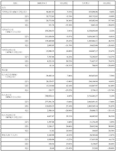 2025年9月,公司客运运力投入(按可用座位公里计)同比上升1.91%,其中国内、国际和地区航线客 运运力投入同比变动分别为-5.57%、25.43%和-31.79%;旅客周转量(按收入客公里计)同比上升 4.85%,其中国内、国际和地区航线旅客周转量同比变动分别为-3.84%、37.10%和-24.94%;客座率为 86.07%,同比上升2.42%,其中国内、国际和地区航线客座率同比变动分别为1.61%、6.77%和7.90%。 | 后有 | 2025年9月 | 图比增长 | 哥亚家片 | )硬化增长 | | --- | --- | --- | --- | --- | | 用力 | | | | | | 可用或公園(ATK)(万吨公園) | 56,857,93 | 5,53% | 215 098 54 | 5.60% | | 134 | 35,772,65 | -5.74% | 345,732×3 | SADDERT: | | 1775 | 20, 773,50 | 31 385 | 184,482,941 | 57.78% | | HECK | 321.78 | =32.28% | 3.883.19 | = ...