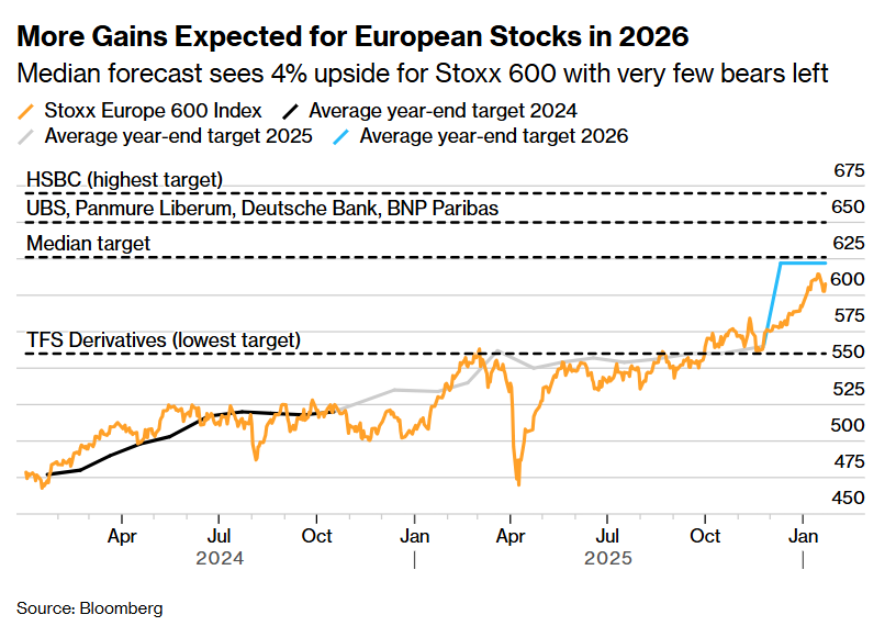 核心观点 - 华尔街策略师普遍看好欧洲股市前景 预测斯托克600指数到2026年底将上涨约4%至626点 尽管面临高估值和地缘政治风险 [1] - 欧洲股市的看涨信心主要基于欧洲经济韧性、盈利增长、宽松货币政策、财政刺激以及美国资金的流入 [2][15] - 市场存在分歧 多数机构看涨 但少数机构如法国巴黎银行预期约4%的下行空间 [2][9] 市场预期与目标点位 - 华尔街策略师共识中位数预期显示 斯托克600指数到2026年底将上涨约4%至626点 [1] - 汇丰是欧洲股市最强劲看涨势力 将斯托克600指数目标从640点上调至670点 意味着今年剩余时间有约11%的潜在上行空间 [2] - 高盛策略师团队本月将斯托克600指数目标点位大幅上调至625点 [15] - 瑞银预计斯托克600指数上行空间将到650点 主要由利润增长推动 [6] - 法国巴黎银行策略师的目标点位为580点 意味着相较近期收盘点位约有4%的下行空间 [9] - 在18位受访华尔街策略师中 仅三位预期约4%或更大幅度的潜在下行空间 [2] 驱动因素与基本面 - 欧洲经济韧性和盈利增长、宽松的货币政策以及更快步伐的财政支出是看涨的主要支撑 [2] - 欧洲经济可获得重大财政支持 包括超过2万亿欧元(约合2.3万亿美元)的AI电网和清洁能源投资 以及德国政府高达5000亿欧元的预算外基础设施基金和增加的国防支出 [9] - 华尔街分析师预计今年欧洲股市整体的企业盈利增长约为10% [9] - 欧洲大陆较强的经济增长和越来越高的债券收益率有利于在欧洲股市权重较高的周期性价值股 [6] - 全球资金对于欧洲股市的仓位配置仍然偏轻 2025年是买盘势力在持续净卖出后试探性回归的一年 [13] - 投资者寻求从集中于高估值科技股的美国市场分散资金配置 这有望提振欧洲股市 [15] 行业与板块观点 - 瑞银分析师团队最为偏好金融、公共事业、交通、零售、医疗设备以及科技硬件类股票 [6] - 对欧洲汽车、化学品、食品、饮料和烟草以及家居产品板块则持谨慎态度 核心原因在于货币政策以及持续关税冲击所带来的压力 [6] - 高盛表示特别看好银行、科技和军工防务领域 [15] - 欧洲股票实测核心领涨主题为半导体、国防军工以及矿业股 而消费品股票则继续滞后于大盘 [9] - 大型银行股与国防军工巨头推动了欧洲股市在2025年全年的绝大部分涨幅 [13] 市场表现与估值 - 欧洲斯托克600指数今年迄今已上涨近3% 在2025年上涨近17%之后继续保持强劲开局涨势 [9] - 欧洲股市自2025年以来的强劲涨幅主要得益于估值扩张 盈利预期正在接力但增幅相对较慢 [13] - 欧股市场的整体估值接近四年来的最高水平 交易在前瞻市盈率15倍左右 [9][10] - 英国富时100指数仍然提供估值支撑 并可能提供非常有利的1年和3年期投资回报 [14] - 瑞士市场是例外 当其前瞻市盈率超过18倍时 往往会出现平稳或负投资回报 [14] 资金流向与投资者情绪 - 美国银行的一项欧洲基金经理调查显示 95%的受访者预计未来12个月欧洲股市将上涨 创下新纪录 超过上个月的92%比例 [14] - 该调查显示 现金水平已降至12年来的最低点 [14] - 与美国客户的对话中发现 他们对全球多元化配置的兴趣更大 尤其看好欧洲价值股 [15] - 长期席卷市场的“美国例外主义论调”触顶并开启回撤轨迹 全球投资者愈发聚焦于非美国股市 尤其是欧洲股市 [15] - 该地区受益于来自美国市场资金的资产分散化配置趋势 预计这种趋势将在今年继续 [14]