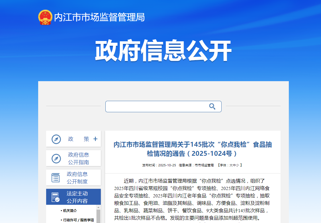 四川省内江市市场监督管理局关于145批次“你点我检”食品抽检情况的通告(2025-1024号)