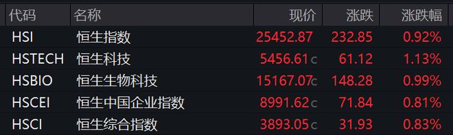 11月24日,香港恒生指数开盘涨0.92%,恒生科技指数涨1.13%。 | 代码 | 名称 | 现价 | 涨跌 | 涨跌幅 | | --- | --- | --- | --- | --- | | મટા | 恒生指数 | 25452.87 | 232.85 | 0.92% | | HSTECH 恒生科技 | | 5456.61 c | 61.12 | 1.13% | | HSBIO | 恒生生物科技 | 15167.07c | 148.28 | 0.99% | | HSCEI | 恒生中国企业指数 | 8991.62 c | 71.84 | 0.81% | | HSCI | 恒生综合指数 | 3893.05 c | 31.93 | 0.83% | 电气设备、有色金属、医药生物、汽车与零配件等板块涨幅居前。 | 小米集团-W | 38.800 | 1.89% | | --- | --- | --- | | 1810.HK | | | | 小鹏汽车-W | 79.850 | 1.72% | | 9868.HK | | | | 快手-W | 65.000 | 1.56% | | 1024.HK | | | | 京东 ...