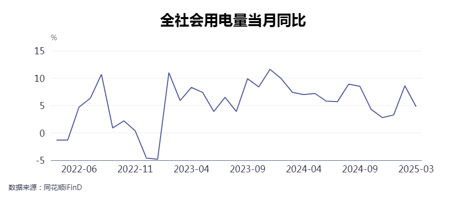 全社会用电量总体情况 - 2025年1-3月全社会用电量累计23846亿千瓦时 同比增长2.5% 其中规模以上工业发电量22699亿千瓦时 [1] - 2025年3月单月全社会用电量8282亿千瓦时 同比增长4.8% 增速较1-2月日均增速提高1.7个百分点 [5][7] - 剔除闰年因素后 2025年一季度全社会用电量日均同比增长3.7% 略高于2024年四季度增速(3.6%) [2] 分产业用电量表现 - 第一产业用电量314亿千瓦时 同比增长8.7% [1] - 第二产业用电量15214亿千瓦时 同比增长1.9% 3月增速较1-2月日均增速提高1.2个百分点 其中制造业用电量增速提高1.4个百分点 [1][5] - 第三产业用电量4465亿千瓦时 同比增长5.2% 3月增速较1-2月日均增速大幅提高3.0个百分点 [1][5] - 城乡居民生活用电量3853亿千瓦时 同比增长1.5% 3月增速较1-2月日均增速提高3.2个百分点 [1][5] 影响用电增长的主要因素 - 闰年因素导致2025年2月同比少一天 对一季度用电量同比增速产生影响 [2] - 气温偏暖是导致一季度用电增速偏低的另一关键因素 尤其影响冬季采暖需求 [2][3] - 受暖冬影响 一季度城乡居民生活用电量同比仅增长1.5% 剔除闰年因素后日均同比增长2.6% 较上年同期降低9.4个百分点 [3] - 安徽 湖南 江苏 湖北 江西 河南等中部地区一季度城乡居民生活用电量同比下降超过2% [3] - 住宿和餐饮业用电量受气温偏暖影响 一季度同比增长3.7% 日均增长4.9% 大幅低于其2024年全年增速(9.6%) [3] 高增长行业与领域 - 信息传输 软件和信息技术服务业用电量保持高速增长 一季度日均同比增长13.7% [4] - 互联网和相关服务用电量在AI 大数据 云计算 5G等带动下增长迅猛 一季度日均同比增长25.7% [4] - 批发和零售业用电量一季度日均同比增长10.3% [4] - 充换电服务业用电量在电动汽车高速发展带动下表现突出 一季度日均同比增长42.3% [4] - 食品制造业用电量一季度日均同比增长6.4% [4] - 高技术及装备制造业用电量一季度日均同比增长4.8% [4] - 汽车制造业用电量一季度日均同比增长10.4% 在安徽 陕西 湖南 浙江 河南等用电规模较大地区增速显著 分别达到31.0% 20.0% 18.9% 16.9%和15.6% [4] - 通用设备制造业 专用设备制造业 仪器仪表制造业 计算机通信和其他电子设备制造业用电量一季度日均同比分别增长7.8% 6.3% 6.2%和6.0% [4]
