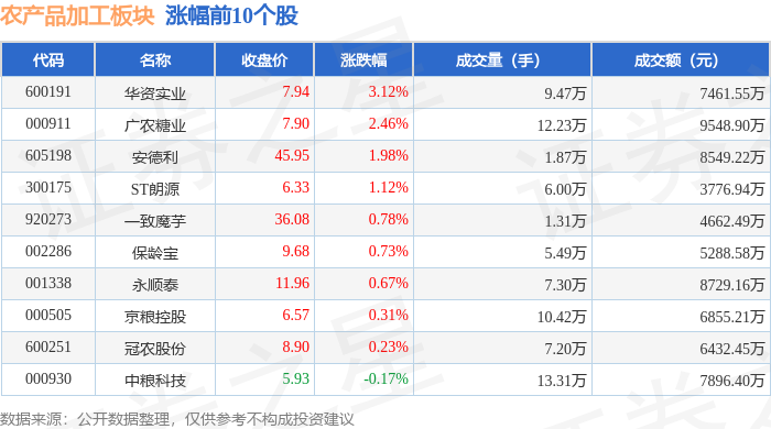 农产品加工板块整体表现 - 10月28日农产品加工板块整体下跌0.63%,表现弱于大盘,当日上证指数下跌0.22%,深证成指下跌0.44% [1] - 板块内资金流向分化,主力资金净流出1.08亿元,而游资资金净流入9570.82万元,散户资金净流入1275.74万元 [2] 领涨个股表现 - 三四级股票领涨板块,收盘价为7.94元,涨幅为3.12%,成交量为9.47万手,成交额为7461.55万元 [1] - 广农糖业涨幅为2.46%,收盘价为7.90元,成交量为12.23万手,成交额为9548.90万元 [1] - 安德利股价上涨1.98%至45.95元,成交量为1.87万手,成交额达8549.22万元 [1] 领跌个股表现 - 道道全为板块领跌股,股价下跌6.32%至10.68元,成交量为25.32万手,成交额达2.72亿元 [2] - 祖名股份跌幅为3.55%,收盘价为20.35元,成交量为7.07万手,成交额为1.44亿元 [2] - 晨光生物股价下跌2.80%至13.52元,成交量为13.39万手,成交额为1.82亿元 [2]