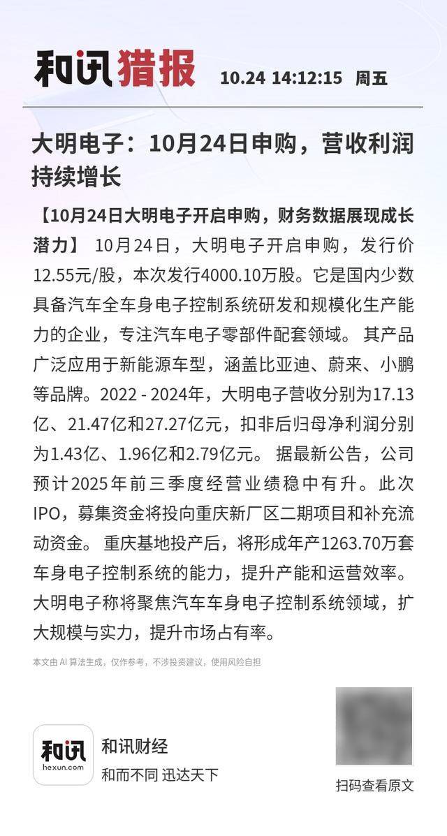 公司IPO与募资 - 大明电子于10月24日开启申购,发行价格为12.55元/股,本次发行4000.10万股 [1] - 此次IPO募集资金将投向重庆新厂区二期项目和补充流动资金 [1] 公司业务与市场地位 - 公司是国内少数具备汽车全车身电子控制系统研发和规模化生产能力的企业,专注于汽车电子零部件配套领域 [1] - 公司产品广泛应用于新能源车型,涵盖比亚迪、蔚来、小鹏等品牌 [1] - 公司称将聚焦汽车车身电子控制系统领域,扩大规模与实力,提升市场占有率 [1][3] 财务表现与增长 - 2022年至2024年,公司营收分别为17.13亿元、21.47亿元和27.27亿元,呈现持续增长 [1] - 2022年至2024年,公司扣非后归母净利润分别为1.43亿元、1.96亿元和2.79亿元,呈现持续增长 [1] - 据最新公告,公司预计2025年前三季度经营业绩稳中有升 [1] 产能扩张与前景 - 重庆基地投产后,将形成年产1263.70万套车身电子控制系统的能力 [1] - 新产能将有助于提升公司产能和运营效率 [1]