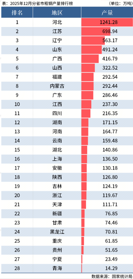 2025年全国分省市粗钢产量出炉