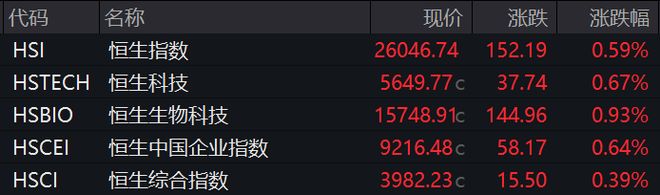 11月26日,香港恒生指数开盘涨0.59%,恒生科技指数涨0.67%。 | 代码 | 名称 | 现价 涨跌 | 涨跌幅 | | --- | --- | --- | --- | | મંદા | 恒生指数 | 26046.74 152.19 | 0.59% | | HSTECH 恒生科技 | | 5649.77c 37.74 | 0.67% | | HSBIO | 恒生生物科技 | 15748.91c 144.96 | 0.93% | | HSCEI | 恒生中国企业指数 | 9216.48c 58.17 1 | 0.64% | | HSCI | 恒生综合指数 | 3982.23c 15.50 | 0.39% | 电气设备、有色金属、银行、医药生物等板块涨幅居前,半导体、国防军工等少数板块下跌。 锂电池概念大涨,赣锋锂业涨超3%,宁德时代涨逾2%。科网股走势分化,蔚来跌近7%,阿里巴巴跌超2%;美团涨超4%, 小鹏汽车涨超2%。小马智 行-W涨超5%。 | 资料 | 成分 | 资讯 | 相关基金 | 月度收益 | | --- | --- | --- | --- | --- | | 名称 | | | 现价 | 涨 ...