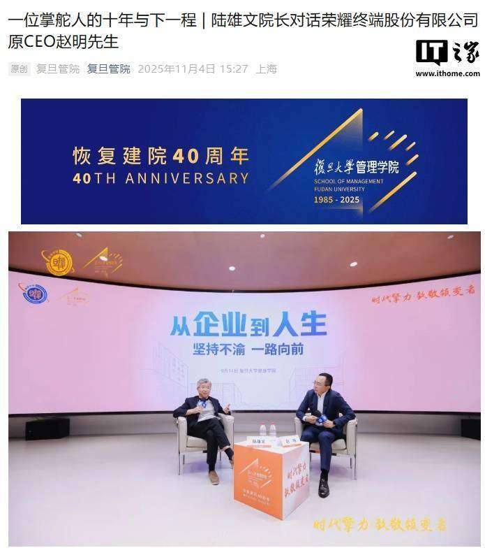 IT之家 11 月 9 日消息,复旦管院官方公众号分享了荣耀终端有限公司前 CEO 赵明与复旦大学管理学院院长陆雄文对话,赵明谈 及了自己人生"新的长征计划",IT之家整理如下。 他表示,至于未来,更希望找到一个能让我真正兴奋起来的方向,一个值得再投入十年甚至更久的事业。在华为的 27 年,几乎把 全部职业生涯都奉献给了一家公司。今天,经过这段沉淀,也在观察行业,思考是否有像当年做荣耀一样,让自己愿意全情投入 的机会。 赵明称:"自从宣布休整以来,外界的各种猜测和讨论一直没有停过。很多朋友发现,从一月开始,我朋友圈都不再更新,点赞和 互动都变得很克制,社交媒体也基本停更了。这样做主要是希望给自己一个安静的空间。过去二十多年我几乎全身心投入工作, 对家庭有不少亏欠,这半年我花了更多时间陪伴家人,同时也开始规律健身,每天一到两个小时,让身体和心态都得到调整。" 赵明称,没有完全远离行业。很多创业者朋友会来向自己请教,自己也会认真看他们的商业计划书,给一些建议,希望把过去二 十多年的经验和对商业规律的理解,回馈给社会和行业里的更多人。 值得一提的是,赵明还谈及了所谓"复出"的问题:"复出并不是'是否'的问题,而是' ...