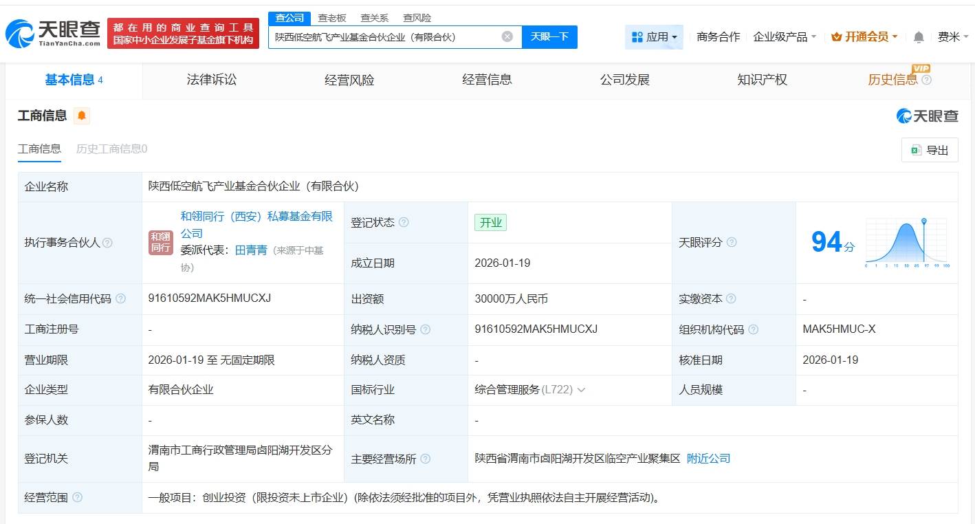 基金设立与基本信息 - 陕西低空航飞产业基金合伙企业(有限合伙)于2026年1月19日成立,登记状态为开业,执行事务合伙人为和翎同行(西安)私募基金有限公司 [1][2] - 基金出资额为3亿人民币(30000万人民币),经营范围为创业投资,主要投资未上市企业 [1][2] - 基金企业类型为有限合伙企业,登记机关为渭南市工商行政管理局卤阳湖开发区分局,主要经营场所位于陕西省渭南市卤阳湖开发区临空产业聚集区 [2] 出资结构与合伙人 - 基金由四家机构共同出资:陕西省政府投资引导基金合伙企业(有限合伙)、渭南市工业倍增发展基金(有限合伙)、和翎同行(西安)私募基金有限公司、西安和翎航装投资合伙企业(有限合伙) [1][3] - 合伙人包括省级政府引导基金、市级产业发展基金以及专业的私募基金管理人和投资机构 [3]
