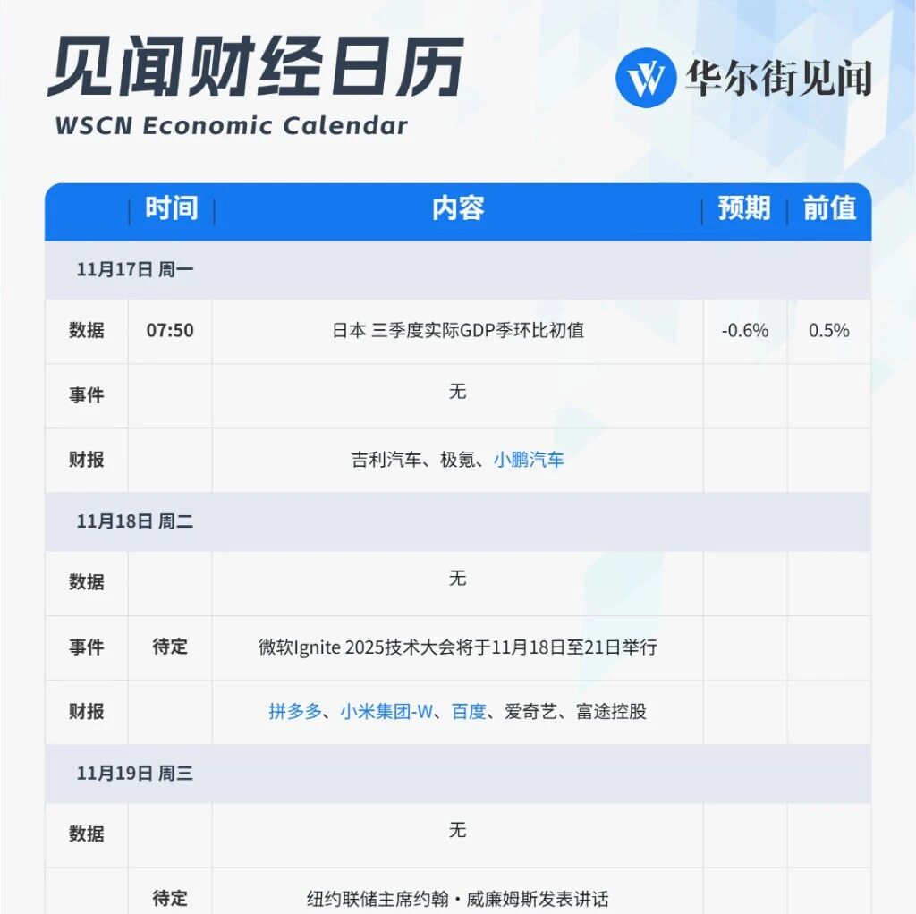 文章核心观点 - 下周(11月17日至11月23日)为关键财经周,重点关注英伟达等大型科技公司财报、美国政府重启后发布的积压经济数据(如非农报告)以及美联储政策动向,这些事件将对AI股走势及市场对美联储降息的预期产生决定性影响 [6][7][14][16] 财报日历 - 11月18日(周二)美股盘前:拼多多、小米、百度、爱奇艺、富途控股发布财报 [4][11] - 11月19日(周三)美股盘后:英伟达发布2025财年第三季度财报,市场预期调整后每股收益1.25美元,营收548亿美元,利润和销售额同比增幅分别为54%和56% [7][11] - 11月20日(周四)美股盘前:网易、沃尔玛发布财报 [4][11] - 11月17日(周一):吉利汽车、极氪、小鹏汽车发布财报 [3] - 11月19日(周三):快手、联想集团、塔吉特发布财报 [4] - 其他重要财报包括多邻国、家得宝、劳氏、罗斯百货等 [10][11] 经济数据 - 11月20日:美国劳工部统计局发布9月非农就业报告,中国公布11月一年期与五年期贷款市场报价利率,市场预期分别维持在3%和3.5%不变 [4][13][15] - 11月21日:美国劳工部统计局发布9月实际薪资等数据 [13] - 11月17日:日本公布三季度实际GDP季环比初值,预期为-0.6%,前值为0.5% [3] - 11月21日:欧元区公布11月制造业PMI初值,预期为50;美国公布11月标普全球制造业PMI初值 [4] - 美国第三季度GDP修正值及10月份PCE价格指数等数据将于11月26日发布 [13] 财经事件 - 11月20日:美联储公布10月FOMC会议纪要,预计将揭示更“鹰派”的降息前景,市场对12月降息的预期已跌破50% [4][16] - 下周多位美联储官员将发表讲话,包括纽约联储主席威廉姆斯和美联储副主席杰斐逊 [4][17][18] - 11月18日至21日:微软Ignite 2025技术大会在旧金山举行,预计吸引超1.7万名参与者,焦点为人工智能与云计算 [3][19] - 11月19日:日本财务省将拍卖8000亿日元的20年期国债 [4][20] - 行业大会包括11月19日的2025数据存储产业大会(广州)、11月17-20日的中国国际光伏与储能产业大会(展览面积超6万平方米,参展企业超6000家)及11月17-21日的迪拜航空展(参展商超1500家,中国C919客机首次中东展示) [21][22][23]