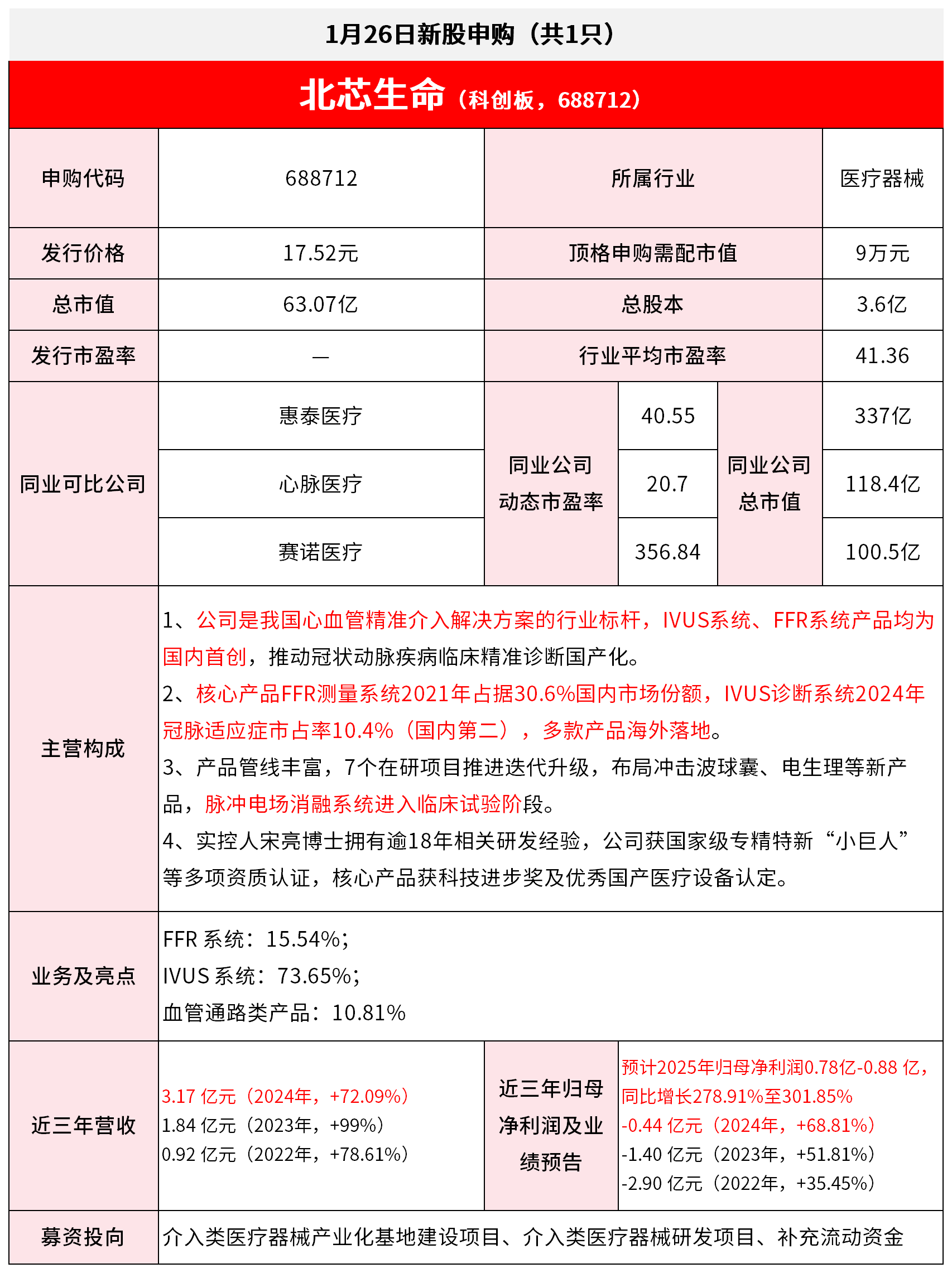 新股申购基本信息 - 北芯生命于1月26日进行新股申购,申购代码为688712,发行价格为17.52元,总市值为63.07亿元 [1][2] 公司业务与市场地位 - 公司是我国心血管精准介入解决方案的行业标杆,其产品为国内首创,推动冠状动脉疾病临床精准诊断国产化 [2] - 核心产品FFR测量系统在2021年占据30.6%的国内冠脉适应症市场份额,市场占有率为10.4%,位居国内第二 [2] - 公司产品管线丰富,拥有7个在研项目推进迭代升级,其中脉冲电场消融系统已进入临床试验阶段 [2] - 公司主营构成:FFR系统占15.54%,IVUS系统占73.65%,血管通路类产品占10.81% [3] 财务表现 - 公司近三年营收持续高速增长:2022年为0.92亿元(同比增长78.61%),2023年为1.84亿元(同比增长99%),2024年为3.17亿元(同比增长72.09%) [3] 管理层与资质 - 公司实控人宋亮博士拥有逾18年相关研发经验,核心产品获得科技进步奖及优秀资质认证 [2] 行业与可比公司 - 同业可比公司包括惠泰医疗、心脉医疗、赛诺医疗 [2]