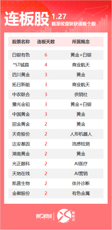 | 生板股 | 1.27 | | | --- | --- | --- | | | | 截至收盘斩获连板个股 | | 股票名称 | 连板天数 | 所属概念 | | 白银有色 | 6 | 黄金+日银 | | *ST铖昌 | ম | 商业航天 | | 四川黄金 | 3 | 黄金 | | 拓日新能 | 3 | 商业航天 | | 中农联合 | 3 | 供销社 | | 豫米金铝 | 3 | 黄金+日银 | | 中国黄金 | 3 | 重要 | | 招金黄金 | 2 | 黄金 | | 天奇股份 | 2 | 人形机器人 | | 达安基因 | 2 | 流感检测 | | 湖南黄金 | 2 | 重等 | | 米正眼科 | 2 | Al医疗 | | 天地在线 | 2 | Al营销 | | 凯普生物 | 2 | 体外诊断 | | 金徽股份 | 2 | 有色金属 | 一图速览今日连板股>> 1月27日,Wind数据显示,A股市场共计59只个股涨停。其中黄金概念多股连板,白银有色收获6连板, 四川黄金3连板。一图速览今日连板股>> ...