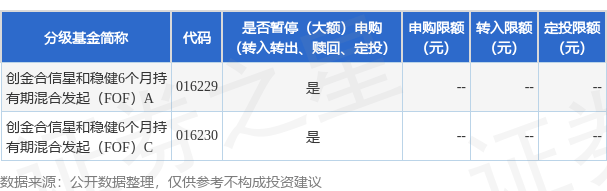 证券之星消息,10月24日创金合信基金管理有限公司发布《创金合信星和稳健6个月持有期混合型发起 式基金中基金(FOF)暂停申购(含定期定额投资)业务的公告》。公告中提示,为保护基金份额持有 人利益,自2025年10月27日起创金合信星和稳健6个月持有期混合型发起式基金中基金(FOF)暂停申 购(含定期定额投资)业务,下属分级基金调整明细如下: 以上内容为证券之星据公开信息整理,由AI算法生成(网信算备310104345710301240019号),不构成 投资建议。 | 分级基金简称 | 代码 | 是否暂停(大额)申购 (转入转出、赎回、定投) | 申购限额 转入限额 定投限额 (元) (元) | (元) | | --- | --- | --- | --- | --- | | 创金合信星和稳健6个月持 有期混合发起(FOF) A | 016229 | 분 | | | | 创金合信星和稳健6个月持 有期混合发起(FOF) C | 016230 | 루 | | | ...