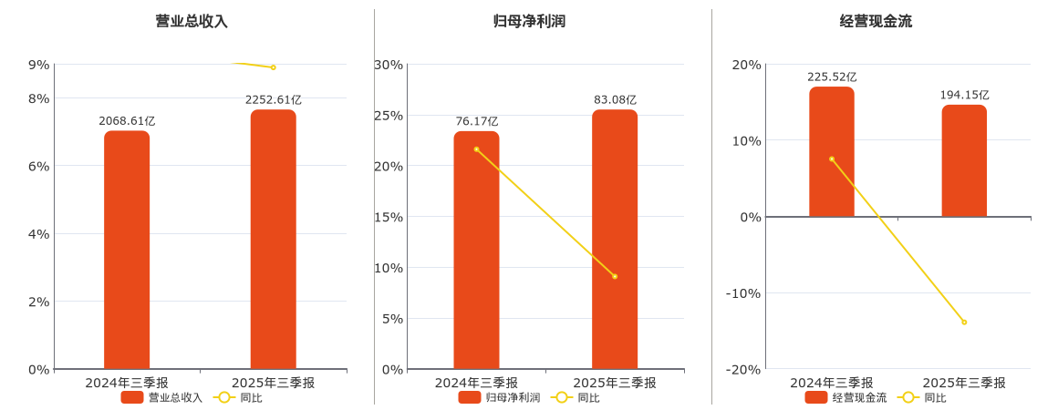财务业绩摘要 - 公司前三季度实现营业收入2252.61亿元,同比增长8.89% [1] - 公司前三季度实现归属于上市公司股东的净利润83.08亿元,同比增长9.07% [1] - 第三季度营业收入达784.03亿元,同比增长8.21% [1] - 第三季度实现归母净利润25.71亿元,同比下降8.53% [1] - 第三季度扣除非经常性损益的净利润为22.27亿元,同比下降14.17% [1] 第三季度业务量表现 - 第三季度总件量达到43.1亿票,同比增长33.4% [1] - 业务规模快速扩张的同时,单季盈利出现短期波动 [1] 盈利波动原因与成本控制 - 盈利波动源于公司积极主动的市场拓展策略与必要的长期战略投入 [1] - 第三季度公司毛利额为97.9亿元,同比下降4.4% [1] - 为提升市场拓展能力,销售费用率同比上升0.2个百分点 [1] - 第三季度管理费用率基本持平,研发费用率和财务费用率分别同比下降0.2和0.3个百分点 [1] 分业务板块表现 - 第三季度速运物流业务收入同比增长14.4%,保持稳健 [2] - 供应链及国际业务收入同比下降5.3%,主要因国际货运代理业务收入受海运价格较去年同期高位显著回落影响 [2] - 剔除海运价格影响后,国际快递及跨境电商物流业务收入同比增长27%,较上半年提速 [2] - 在工业设备、通信高科技、汽车等行业的物流收入均实现同比超过25%的增长 [2] 现金流与应收账款 - 前三季度公司经营活动产生的现金流量净额为194.15亿元,同比下降13.91% [2] - 截至报告期末,公司应收账款账面价值从年初的277.15亿元增长至293.61亿元 [2] 业绩展望与股份回购 - 公司管理层致力于实现2025年第四季度的归母净利润同比基本持平 [2] - 公司目标为2025年年度归母净利润同比保持稳健增长 [2] - 公司计划将2025年第1期A股回购股份方案的资金总额由不低于5亿元且不超过10亿元大幅上调至不低于15亿元且不超过30亿元 [2]