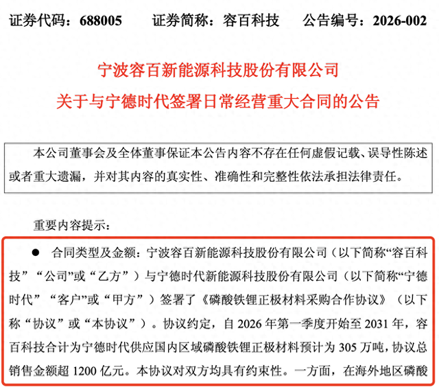 与此同时,近期碳酸锂价格持续走强也引发市场对上游资源端的关注。13日盘中,碳酸锂期货主力合约 一度触及涨停,最高报174060元/吨,创两年来新高。有分析指出,电池出口增值税退税将逐步取消, 刺激短期抢出口需求。同时下游电池大厂补库需求增强,短期价格或延续强势。 1200亿元超级大单 1月13日,容百科技发布公告称,公司与宁德时代新能源科技股份有限公司签署了《磷酸铁锂正极材料 采购合作协议》。协议约定,自2026年第一季度开始至2031年,容百科技合计为宁德时代供应国内区域 磷酸铁锂正极材料预计为305万吨,协议总销售金额超1200亿元。本协议对双方均具有约束性。 转自:北京日报客户端 1月13日容百科技公告称,公司与宁德时代签署了《磷酸铁锂正极材料采购合作协议》,自今年第一季 度开始至2031年,将向宁德时代国内区域供应磷酸铁锂正极材料305万吨,总销售金额超1200亿元。有 业内人士评论称,如此大的订单量和协议金额,在锂电行业罕见,或将对容百科技未来的业绩产生积极 影响。 关于市场需求,容百科技分析称,一方面,在海外地区,磷酸铁锂动力电池市场仍有较 大的发展空 间。另一方面,随着锂电技术的发展,使得储能电 ...