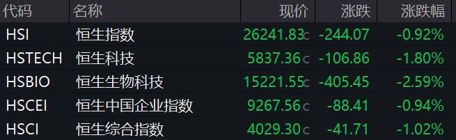 市场指数表现 - 香港恒生指数收于26241.83点,下跌244.07点,跌幅0.92% [1][2] - 恒生科技指数收于5837.36点,下跌106.86点,跌幅1.80% [1][2] - 恒生中国企业指数收于9267.56点,下跌88.41点,跌幅0.94% [2] - 恒生综合指数收于4029.30点,下跌41.71点,跌幅1.02% [2] - 恒生生物科技指数收于15221.55点,下跌405.45点,跌幅2.59% [2] 行业板块表现 - 有色金属板块表现强势,天齐锂业股价上涨超过7%,赣锋锂业股价上涨超过3% [2] - 黄金珠宝概念股冲高回落,珠峰黄金和周六福股价上涨超过5%,万国黄金集团股价上涨超过2% [2] - 黄金珠宝板块内部分化,大唐黄金股价下跌7%,周生生股价下跌3%,周大福和老铺黄金股价下跌2% [2] 个股表现 - 科技股普遍下跌,滴普科技股价下跌超过30%,文远知行股价下跌超过13%,小马智行股价下跌11% [4] - 消费及娱乐类个股走弱,乐华娱乐股价下跌超过9%,泡泡玛特股价下跌5.88%,东方甄选股价下跌超过5% [4][5] - 大型科技公司股价下跌,阿里巴巴股价下跌2.97%至160.100港元,小米集团股价下跌2.76%至42.240港元,腾讯控股股价下跌1.55%至634.000港元 [5] - 部分个股逆势上涨,小鹏汽车股价上涨1.68%至90.900港元 [5] - 其他知名公司股价下跌,美团股价下跌1.26%至102.000港元,快手股价下跌5.93%至68.250港元,中芯国际股价下跌1.95%至75.450港元 [5]