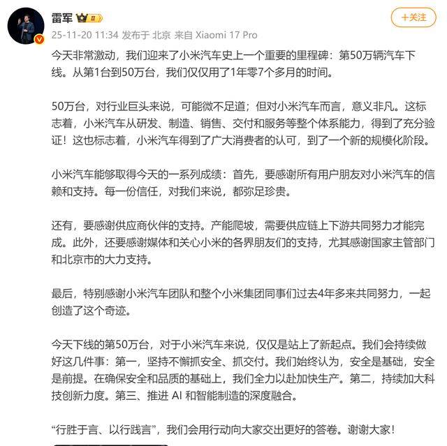 11月20日,小米汽车宣布第50万辆整车下产线。对此,小米创办人、董事长兼CEO雷军在社交平台发文 称,从第1台到50万台,我们仅仅用了1年零7个多月的时间。这标志着小米汽车得到了广大消费者的认 可,到了一个新的规模化阶段。 来源:@雷军 ...
