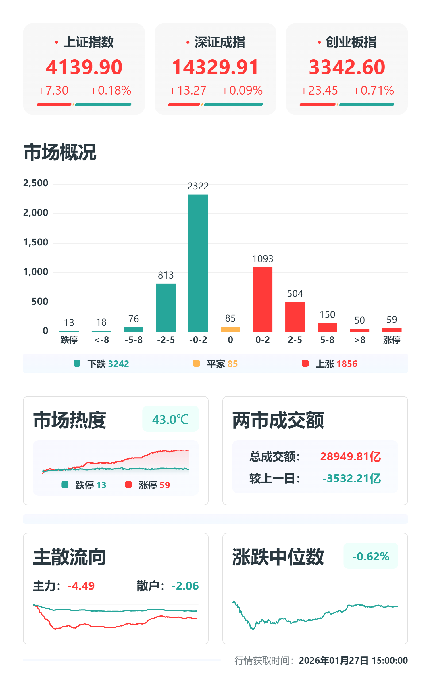 1月27日,A股上演翻盘好戏,早盘出现跳水,随后稳步收复失地,午后主要指数悉数翻红,尾盘尽管再现"神秘力量"控盘,但指数顽强收红。 根据交易所数据,上证指数涨0.18%报4139.9点,深证成指涨0.09%,创业板指涨0.71%,沪深300跌0.03%,科创50涨1.51%。 沪深两市1856股上涨,3237股下跌,90股持平,合计成交额2.89万亿元,较前一交易日缩量约3532.19亿元,大盘主力资金净流出559.36亿元。 "没有概率优势的预判容易出错,考虑到人性的弱点,出错后纠错的难度就比较大,所以这里尽量降低交易频率,就能减少交易出错率。"徐小明说,市场不 会在这里横太久,向上50个点到4188点出顶部钝化,向下90个点破趋势。上下140个点的空间,已经横了半个月了,还能横多久? 继续静观其变,等云开见 月。 风险提示:此文章不构成投资建议。股市有风险,投资需谨慎。 股票频道更多独家策划、专家专栏,免费查阅>> 责任编辑:安东 半导体主力资金净流入居首,通信设备、银行、保险、航天航空也获得主力资金净流入;有色金属主力资金净流出最多,电网设备、电池、汽车零部件、贵 金属紧随其后。题材方面白银、汽车芯片、 ...