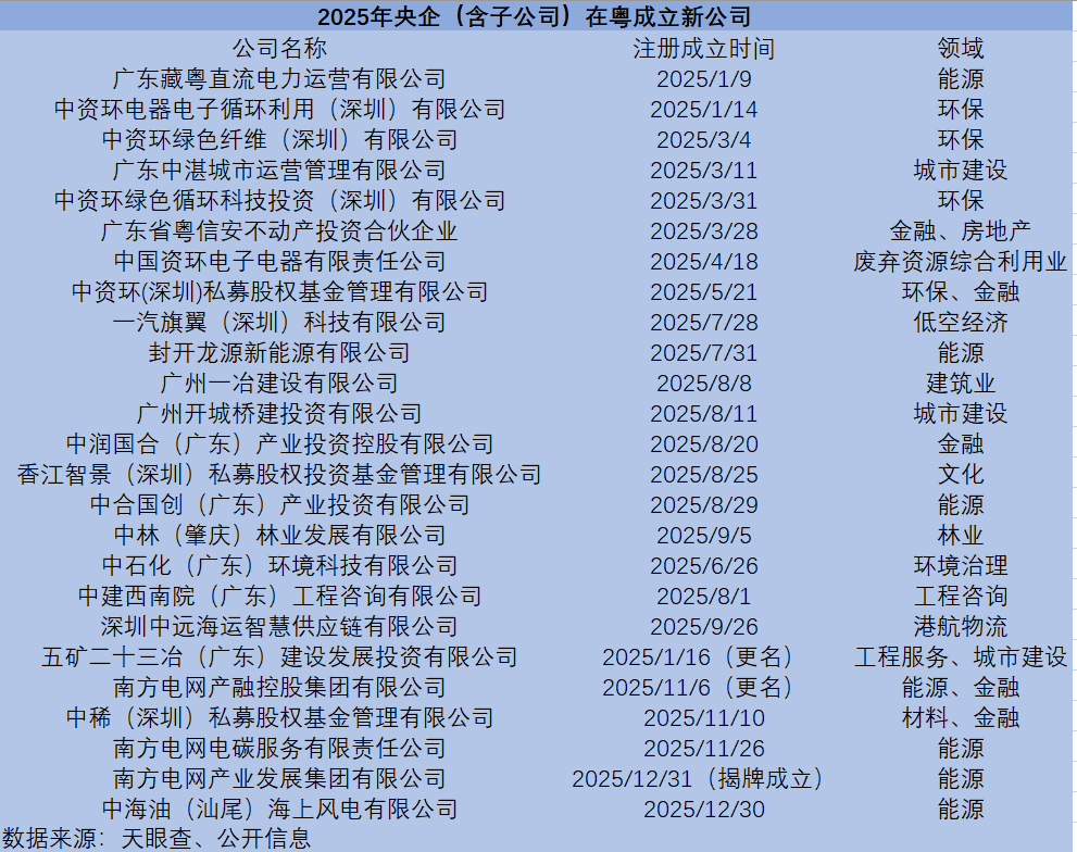 文章核心观点 - 2025年至2026年初,中央企业(含子公司)在广东省,特别是粤港澳大湾区,掀起了设立新实体公司的热潮,这被视为比项目合作更具长期性和战略性的布局,意味着将广东作为独立的增长极进行培育 [1] - 仅2025年一年,据不完全统计,至少有25家央企(含子公司)在广东设立了新公司,涉及能源、环保、城市建设、金融、低空经济、农业科技等多个战略性新兴产业领域 [1][2][5] - 央地合作不断深化,新公司的设立既是对广东营商环境、市场潜力和战略地位的认可,也释放出央企长期扎根、与地方经济深度绑定的信号,旨在实现优势互补、构建开放协同的产业生态 [5][6][8] 央企在粤投资规模与战略重点 - 南方电网作为总部在粤的电力央企,连续数年在粤投资保持千亿元规模,2026年其宣布安排**1800亿元**用于固定资产投资,连续五年创新高,重点投向新型电力系统建设、战略性新兴产业等领域 [3] - 国有企业正以空前力度布局战略性新兴产业,年均投资增速超过**20%** [6] - 央企在粤布局不仅限于传统的项目合作,更倾向于设立实体公司,2025年至少有**25家**新公司成立,2026年初投资节奏仍在继续 [1][5] 新设立公司的领域与地域分布 - **重点领域**:新公司业务覆盖城建、能源、环保、新材料、数字科技、低空经济、农业科技等,绿色低碳成为布局的突出偏好方向 [5][8] - **地域分布**:广州和深圳是吸引央企布局的“双子星”,同时粤东西北地区也有项目落地,如湛江、茂名、汕尾等 [5] - **公司类型**:包括专业化公司、平台型公司及工程项目类公司,合作层次和分布领域展现出央地合作的深度和广度 [5] 代表性央企及其在粤布局案例 - **南方电网**:2025年底至2026年初,在广州密集成立了三家全资子公司,包括南网产融集团、南网电碳公司、南网产业发展集团,以聚焦能源主业并发挥协同作用 [2][3] - **中国资源循环集团**:作为2024年10月成立的“国家队”新成员,在成立半年后于深圳密集设立了多家子公司,如中国资环电子电器有限责任公司等,布局循环经济业务 [3] - **中国稀土集团**:其创新总部基地中稀科创落户深圳,并于2025年11月成立了中稀(深圳)私募股权基金管理有限公司,构建“稀土+战略新兴”创新生态 [4][7] - **中国一汽**:通过一汽旗翼(深圳)科技有限公司布局低空经济,该公司在成立**5个月**后即完成了电动垂直起降飞行汽车原型机“红旗天辇1号”的首飞 [6] 央地合作的驱动因素与模式创新 - **驱动因素**:广东丰富的应用场景、制度创新、齐全的产业配套与央企拓展新兴产业的需求高度吻合,成为新技术的试验场 [6] - **模式创新 - 产融结合**:以融促产、产融结合成为标配,多家央企设立了私募股权基金管理公司(如中稀、中资环旗下基金),旨在通过市场化基金方式投资产业链关键环节,服务主业并培育新产业 [8][9] - **模式创新 - 产业生态构建**:央企凭借其创新能力和品牌效应,带动中小企业聚集,通过供需对接构建融通发展的产业生态,例如深圳已集聚超**1900家**低空经济产业链企业,形成全链条生态 [6][8]