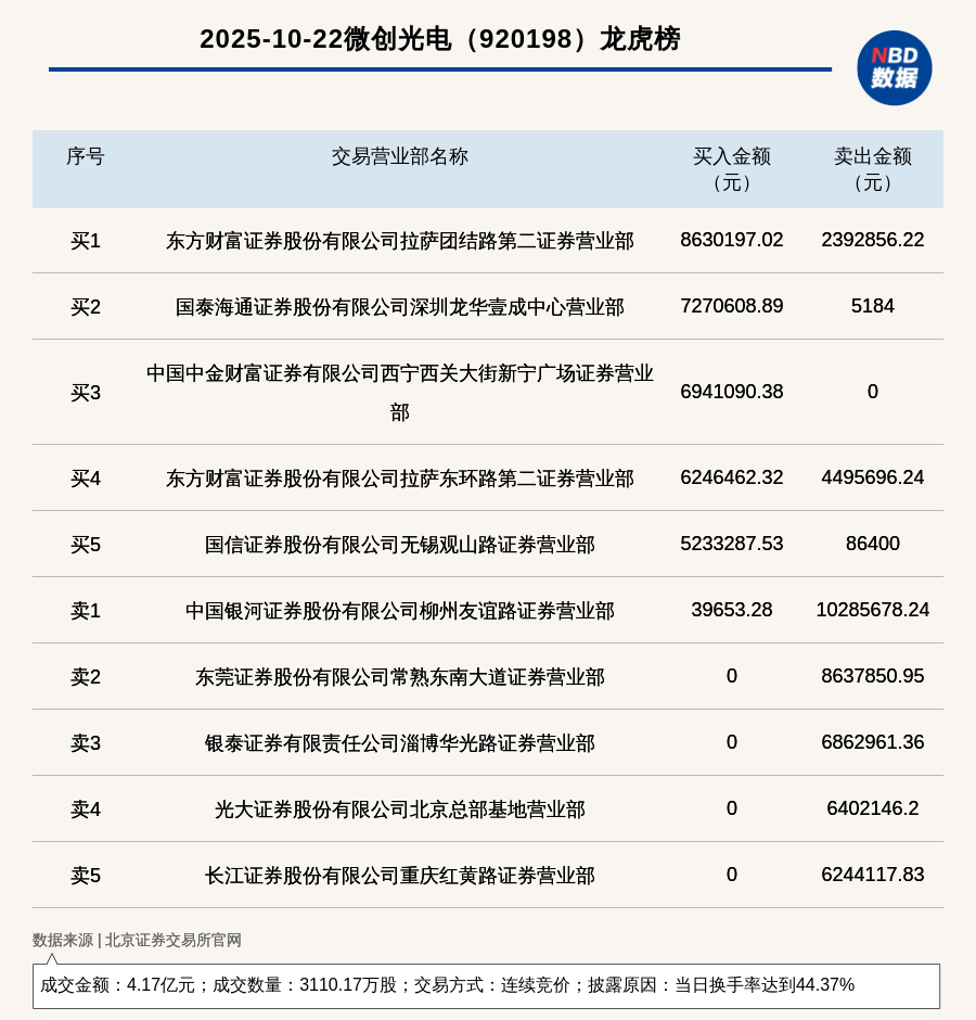 每经讯,2025年10月22日,北交所上市公司微创光电(920198,收盘价:12.19元)登上龙虎榜,交易方式是连续竞价,披露原 因是当日换手率达到44.37%,成交数量3110.17万股,成交金额4.17亿元。买一席位为东方财富证券股份有限公司拉萨团结路第 二证券营业部,买入863.02万元;卖一席位为中国银河证券股份有限公司柳州友谊路证券营业部,卖出1028.57万元。 (记者 曾健辉) 免责声明:本文内容与数据仅供参考,不构成投资建议,使用前核实。据此操作,风险自担。 每日经济新闻 ...