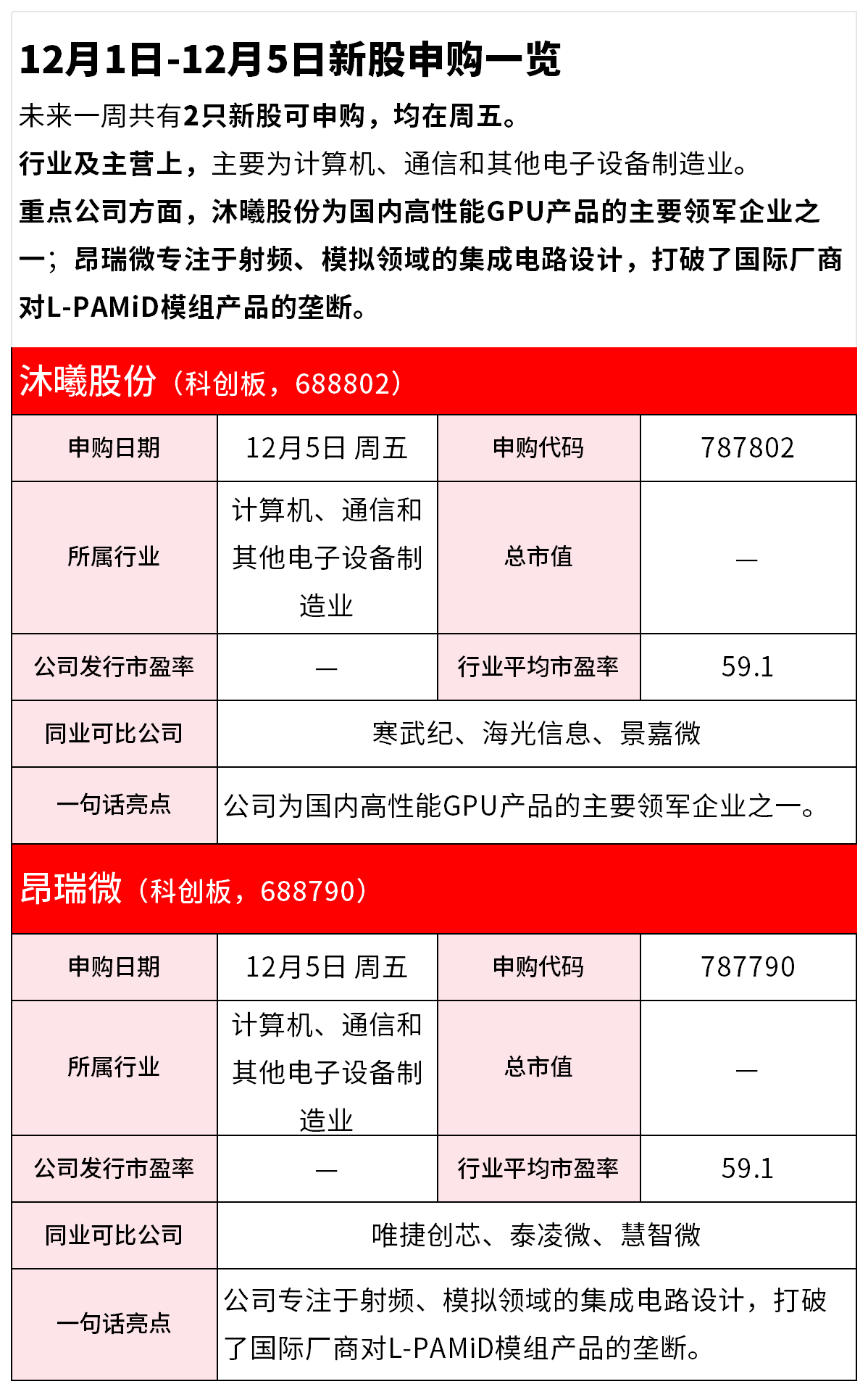 新股申购安排 - 未来一周(12月1日至12月5日)共有2只新股可申购,申购日期均为12月5日(周五)[1] - 两只新股均属于计算机、通信和其他电子设备制造业[1] 沐曦股份 (科创板,688802) 核心信息 - 申购代码为787802[2] - 公司为国内高性能GPU产品的主要领军企业之一[1][2] - 同业可比公司包括寒武纪、海光信息、景嘉微[2] - 所属行业平均市盈率为59.1[2] 昂瑞微 (科创板,688790) 核心信息 - 申购代码为787790[2] - 公司专注于射频、模拟领域的集成电路设计[1][3] - 公司打破了国际厂商对L-PAMiD模组产品的垄断[1][3] - 同业可比公司包括唯捷创芯、泰凌微、慧智微[3] - 所属行业平均市盈率为59.1[3]