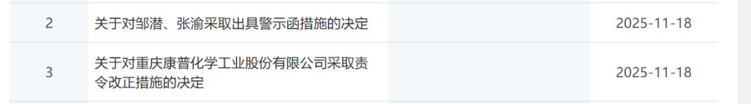 监管处罚决定 - 重庆证监局对重庆康普化学工业股份有限公司采取责令改正的行政监管措施 [1][3] - 公司董事长邹潜和董事会秘书张渝因未勤勉尽责被采取出具警示函的行政监管措施 [1][3] - 相关违规情况被记入证券期货市场诚信档案 [3] 具体违规行为 - 公司募投项目延期未提交董事会审议并披露,且未及时披露项目进入试生产及延期试生产信息 [3] - 未充分披露募投项目存在技术障碍导致延期以及完工当年业绩与盈利预测存在较大偏差的情况 [3] - 公司2023年上半年存在未及时确认收入情形,导致2023年半年度财务报表数据不准确 [3] 公司基本状况 - 重庆康普化学工业股份有限公司于2022年在北京证券交易所上市 [4] - 公司主要从事金属萃取剂产品的研发、生产和销售 [4] - 董事长邹潜为公司实际控制人,持股比例为38.62% [4] 近期财务表现 - 2025年前三季度公司实现营业收入1.75亿元,同比减少38.57% [4] - 2025年前三季度归属于上市公司股东的净利润为3717.20万元,同比减少53.10% [4] 市场反应 - 二级市场上,康普化学股价在11月18日收跌3.43%,报收18.3元/股 [4]