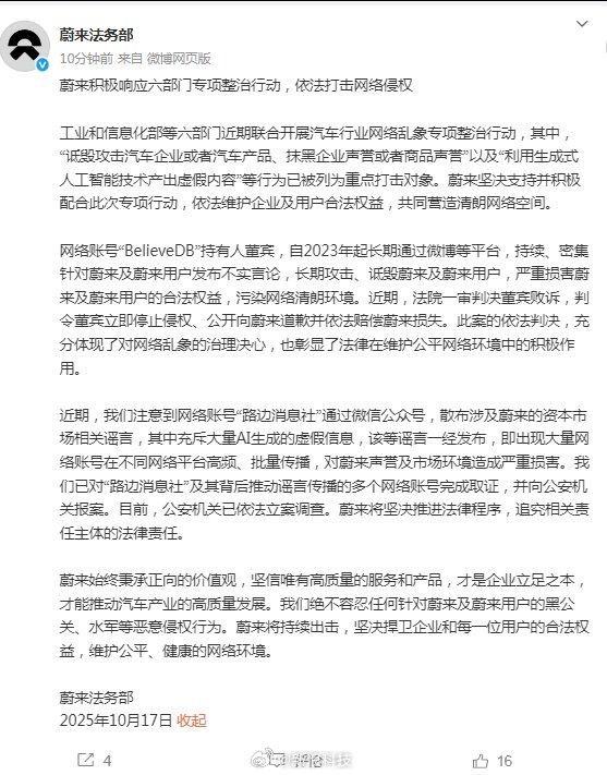 10月17日,蔚来法务部发文称,蔚来积极响应六部门专项整治行动,依法打击网络侵权工业和信息化部 等六部门近期联合开展汽车行业网络乱象专项整治行动,其中,"诋毁攻击汽车企业或者汽车产品、抹 黑企业声誉或者商品声誉"以及"利用生成式人工智能技术产出虚假内容"等行为已被列为重点打击对 象。蔚来坚决支持并积极配合此次专项行动,依法维护企业及用户合法权益,共同营造清朗网络空间。 ...