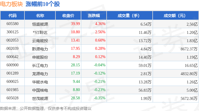 电力板块整体市场表现 - 11月18日电力板块整体下跌1.02%,表现弱于大盘,当日上证指数下跌0.81%,深证成指下跌0.92% [1] - 板块内个股表现分化,恒盛能源领涨,涨幅为4.36%,拓日新能领跌,跌幅达10.08% [1][2] 领涨个股表现 - 恒盛能源收盘价39.99元,上涨4.36%,成交量为6.54万手,成交额为2.56亿元 [1] - *ST玲达收盘价10.80元,上涨2.56%,成交量为11.46万手,成交额为1.20亿元 [1] - 云南能投收盘价13.41元,上涨0.60%,成交量为13.72万手,成交额为1.83亿元 [1] 领跌个股表现 - 拓日新能收盘价4.55元,大幅下跌10.08%,成交量为152.79万手,成交额为7.08亿元 [2] - 闽东电力收盘价13.34元,下跌9.99%,成交量为42.84万手,成交额为5.83亿元 [2] - 上海电力收盘价25.01元,下跌4.54%,成交量为78.47万手,成交额高达19.77亿元 [2] 板块资金流向 - 电力板块整体呈现主力资金净流出24.74亿元,而游资和散户资金分别净流入5.5亿元和19.24亿元 [2] - 国投电力主力资金净流出最多,达3839.54万元,主力净占比为14.04% [3] - 恒盛能源获得主力资金净流入3057.39万元,主力净占比为11.93%,在资金流入榜居前 [3]