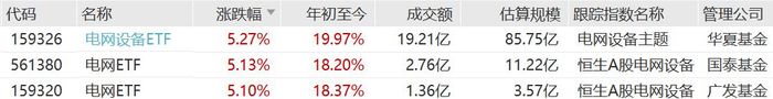 A股市场智能电网股集体走强,电网设备ETF、电网ETF涨超5%。 | 代码 | 名称 | 涨跌幅 ▼ | 年初至今 | 成交额 | 估算规模 跟踪指数名称 | 管理公司 | | --- | --- | --- | --- | --- | --- | --- | | 159326 | 电网设备ETF | 5.27% | 19.97% | 19.21亿 | 85.75亿 电网设备主题 | 华夏基金 | | 561380 | 电网ETF | 5.13% | 18.20% | 2.76 Z | 11.22亿 恒生A股电网设备 国泰基金 | | | 159320 | 电网ETF | 5.10% | 18.37% | 1.36亿 | 3.57亿 恒生A股电网设备 广发基金 | | 国盛证券指出,国网规划"十五五"固投增长40%,2026年或为电网投资""大年"。2026年我国有望开启 电网投资新一轮景气周期: 电网设备ETF是全市场唯一跟踪中证电网设备主题指数的产品,特高压权重占比高达64%,是全市场最 高的,前十大重仓股都是国电南瑞、特变电工这种行业龙头。 电网ETF跟踪的是恒生A股电网设备指数,该指数从市场中选取收入 ...