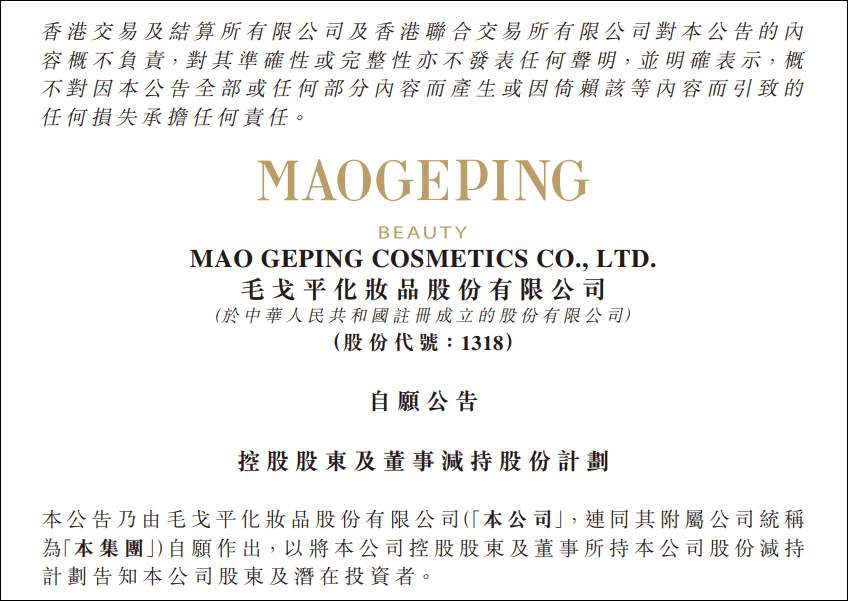 减持计划公告 - 公司控股股东及多名执行董事计划在公告披露之日起6个月内,主要通过大宗交易方式,合计减持不超过1720万股H股,占公司已发行股份总数的3.51% [1] - 计划减持的股东包括创始人毛戈平及其配偶汪立群、两位姐姐毛霓萍和毛慧萍、汪立群弟弟汪立华以及核心高管总裁宋虹佺 [1][2][3] - 按公告日收盘价82港元/股粗略计算,此次减持计划涉及金额最高约14.104亿港元,折合人民币约13亿元 [5] 股东背景与公司治理 - 计划减持的六位股东均为公司核心成员,其中五位为毛戈平家族成员,一位为负责MAOGEPING品牌运营的核心高管 [2][3] - 毛戈平为公司创始人、董事长兼执行董事,其家族成员及配偶均在董事会担任要职并负责公司关键业务管理 [2][4] - 公司执行董事团队加入集团时间早,均在2015年12月16日获委任为董事,负责集团整体战略、品牌管理及培训业务等 [4] 减持原因与市场反应 - 公告称减持原因为股东自身财务需求,资金用途包括美妆相关产业链投资及改善个人生活等 [5] - 公告强调减持计划的具体实施时间、数量及价格存在不确定性,将视市场情况及公司股价等因素决定 [5] - 减持计划公告次日,公司股价不跌反涨,收盘报87.95港元/股,单日涨幅达7.26%,总市值达431亿港元 [6] 公司上市历程 - 公司资本市场之路历经波折,自2016年首次递交A股IPO申请后,经历多次申请、审核与撤回,最终于2024年12月成功在港交所上市 [7] - 公司于2024年12月10日登陆港交所,发行价为29.80港元/股,开盘价为47.65港元/股 [8] - 在IPO市场申购阶段,公司获得全市场认购总额1738.14亿港元,成为2024年港股的“冻资王” [8] 业务概况与财务表现 - 公司旗下拥有两大美妆品牌:旗舰品牌MAOGEPING和至爱终生,产品覆盖护肤品、彩妆及香氛,收入主要来自MAOGEPING品牌 [8] - 公司还经营化妆艺术培训业务,截至2025年上半年已在全国开设九所化妆艺术机构 [8] - 公司营收从2021年的15.77亿元增长至2023年的28.86亿元,复合年增长率为35.3%;净利润从2021年的3.31亿元增长至2023年的6.64亿元,复合年增长率为41.6% [8] - 2024年上市首年,公司实现营收38.85亿元,同比增长34.6%;净利润8.81亿元,同比增长32.8% [9] - 2025年上半年,公司延续增长势头,实现营收25.88亿元,同比增长31.3%;净利润6.70亿元,同比增长36.1% [10]