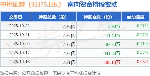证券之星消息,10月22日南向资金减持5.9万股中州证券(01375.HK)。近5个交易日中,获南向资金减 持的有4天,累计净减持256.7万股。近20个交易日中,获南向资金减持的有12天,累计净减持2119.0万 股。截至目前,南向资金持有中州证券(01375.HK)7.26亿股,占公司已发行普通股的60.76%。 | 交易日 | 持股总数(股) | 持股变动(股) | 变动幅度 | | --- | --- | --- | --- | | 2025-10-22 | 7.26亿 | -5.90万 | -0.01% | | 2025-10-21 | 7.27亿 | -11.40万 | -0.02% | | 2025-10-20 | 7.27亿 | -82.70万 | -0.11% | | 2025-10-17 | 7.27亿 | -341.80万 | -0.47% | | 2025-10-16 | 7.31亿 | 185.10万 | 0.25% | 中原证券股份有限公司是一家从事证券经纪业务的中国公司。该公司运营八个分部。证券经纪业务分部 从事代理客户买卖股票、基金、债券等业务。自营业务分部从事权益投资、固定收 ...