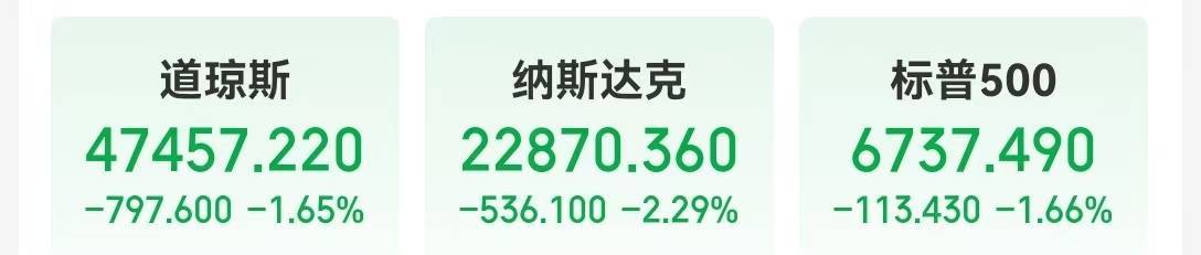 全球主要股指表现 - 美国三大股指全线收跌,道琼斯工业平均指数下跌1.65%至47457.22点,标普500指数下跌1.66%至6737.49点,纳斯达克指数下跌2.29%至22870.36点 [1] - 欧洲主要股指普遍下跌,德国DAX指数下跌1.36%至24048.84点,法国CAC40指数微跌0.11%至8232.49点,英国富时100指数下跌1.05%至9807.68点 [1] 美国大型科技股表现 - 多数大型科技股收跌,特斯拉跌幅超过6%,英伟达跌幅超过3%,谷歌和亚马逊跌幅接近3%,微软跌幅超过1%,苹果微跌0.19% [1] - 脸书逆势上涨0.14% [1] 热门中概股表现 - 多数热门中概股下跌,百度跌幅超过6%,哔哩哔哩跌幅超过4%,小鹏汽车和蔚来跌幅均超过3% [1] 大宗商品市场 - 国际油价小幅上涨,美国WTI原油期货主力合约上涨0.19%至58.6美元/桶,布伦特原油期货主力合约上涨0.29%至62.89美元/桶 [1] - 贵金属期货普遍收跌,COMEX黄金期货下跌0.93%至4174.5美元/盎司,COMEX白银期货下跌2.30%至52.23美元/盎司 [1] - 伦敦基本金属全线下跌,LME期锌下跌1.12%至3040.50美元/吨,LME期铅下跌0.98%至2075.00美元/吨,LME期锡下跌0.89%至37065.00美元/吨,LME期铜下跌0.78%至10859.00美元/吨,LME期镍下跌0.65%至14955.00美元/吨,LME期铝下跌0.60%至2877.00美元/吨 [1] 外汇与债券市场 - 美元指数下跌0.30%至99.18,离岸人民币对美元升值151个基点至7.0974 [1] - 美国国债收益率全线上涨,2年期收益率上涨2.91个基点至3.591%,10年期收益率上涨5.18个基点至4.121%,30年期收益率上涨4.77个基点至4.712% [1] - 欧洲主要国家国债收益率集体上涨,英国10年期国债收益率上涨3.9个基点至4.436%,德国10年期国债收益率上涨4.4个基点至2.686% [1]