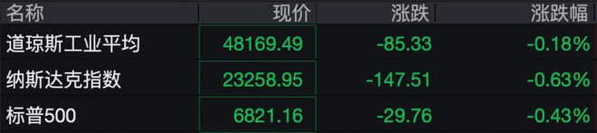 11月13日,美股 三大指数开盘齐跌 ,道指跌0.18%,标普500指数跌0.43%,纳指跌0.63%。 科技股多数下跌, AMD 跌超2%, 英伟达 、 特斯拉 跌近2%。 中概股走势不一, 阿特斯太阳 能 涨超10%, 阿里巴巴 涨逾3%, 哔哩哔哩 跌超6%, 小马智行 跌逾 3%。 编辑丨钉钉 | 名称 | 现价 | 涨跌 | 涨跌幅 | | --- | --- | --- | --- | | 道琼斯工业平均 | 48169.49 | -85.33 | -0.18% | | 纳斯达克指数 | 23258.95 | -147.51 | -0.63% | | 标普500 | 6821.16 | -29.76 | -0.43% | ...