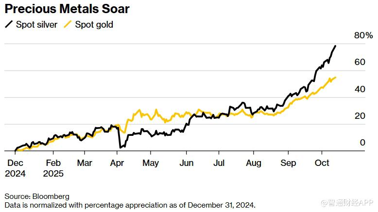 智通财经APP获悉,白银市场掀起近半个世纪以来罕见的逼空行情。伦敦市场的历史性"空头挤压"加剧,现货 白银一度大涨3.9%,突破52美元/盎司,创下数十年来新高,远超上周峰值。与此同时,黄金延续八周连涨势 头,再度刷新历史纪录,盘中最高突破4115美元/盎司。 市场对伦敦银流动性枯竭的担忧不断升温。伦敦现货银价逼近1980年创下的52.5美元纪录,伦敦与纽约之间的 价差升至近乎前所未有的水平。 据悉,部分交易商甚至包下跨大西洋航班的货运仓位,将银条空运至伦敦,以套利价差。通常这种昂贵运输方 式只用于黄金。周一伦敦现货银的溢价达到每盎司1.4美元。 与此同时,伦敦市场白银租赁利率(即借入实物银的年化成本)飙升至超过30%,令空头回补成本高企。黄金与 钯金的租赁利率也同步收紧,显示投资者强劲的实物需求正进一步抽干伦敦的贵金属库存。今年早些时候,市 场曾因大量金银流向纽约而导致伦敦库存下降。 高盛在报告中指出,白银市场流动性较弱,其规模约为黄金的九分之一,因而放大了价格波动。报告写 道:"由于没有央行长期买盘支撑银价,一旦投资资金出现短暂撤出,价格可能剧烈回调,同时缓解此前推动 行情的伦敦供需紧张。" 包括黄金、白 ...